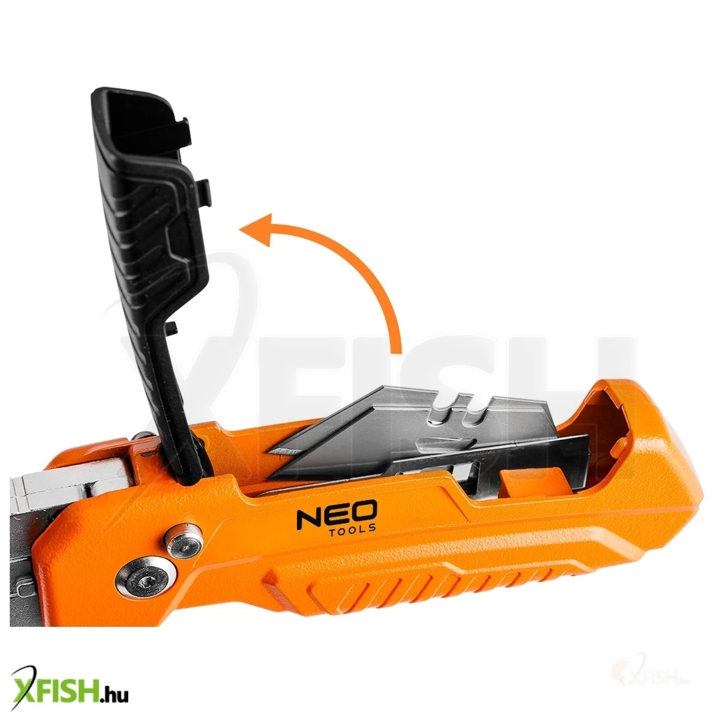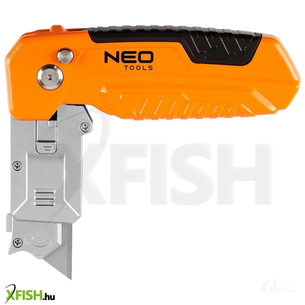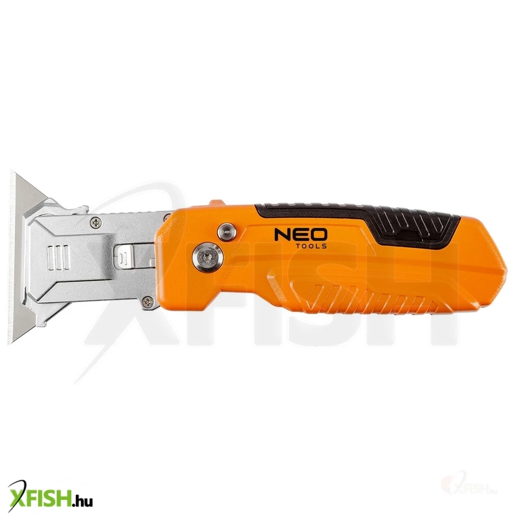 Neotools trapézpengés kés, 90 fokban elfordítható fejjel, vágó és kaparó funkció, összecsukható, aluházas, 2db pengével