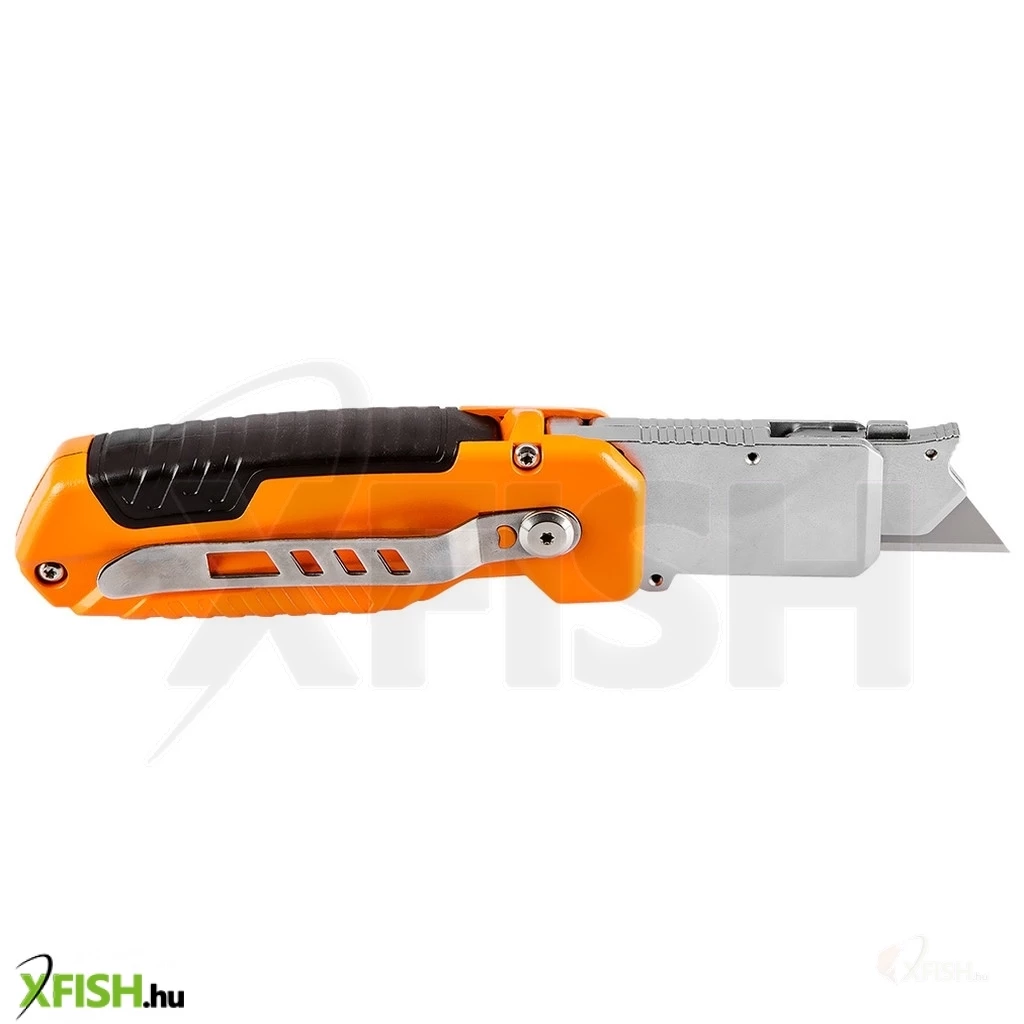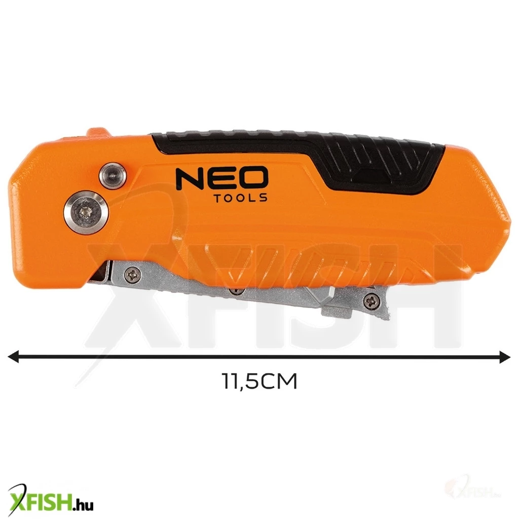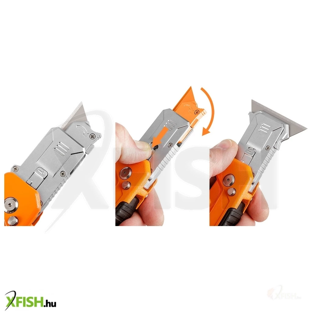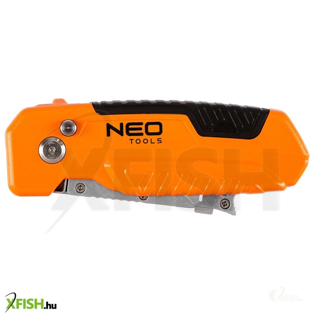 Neotools trapézpengés kés, 90 fokban elfordítható fejjel, vágó és kaparó funkció, összecsukható, aluházas, 2db pengével