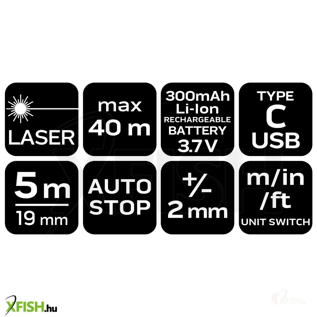 Az eszköz lézeres méréstartománya 40 méter, amely lehetővé teszi a pontos távolságmérést még nagyobb távolságok esetén is. A lézeres mérési rendszer gyors és pontos mérési eredményeket kínál, így ideális mind szakmai felhasználásra, mind otthoni projektekhez. A beépített mérőszalag 19 mm szélességű és akár 5 méteres hosszúságot is elér, amely tökéletes a szűkebb terek és rövidebb távolságok mérésére.