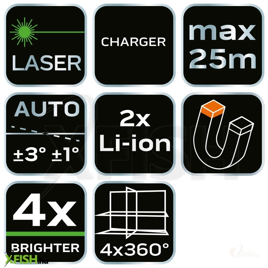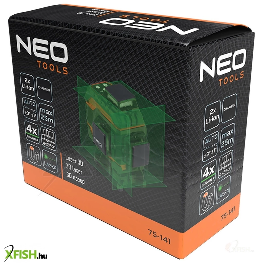 Neotools lézeres szintező, 3d önbeálló keresztvonallézer, 360°, 16 lézervonal, 25m hatótáv, akku, tartozékok, táska, zöld