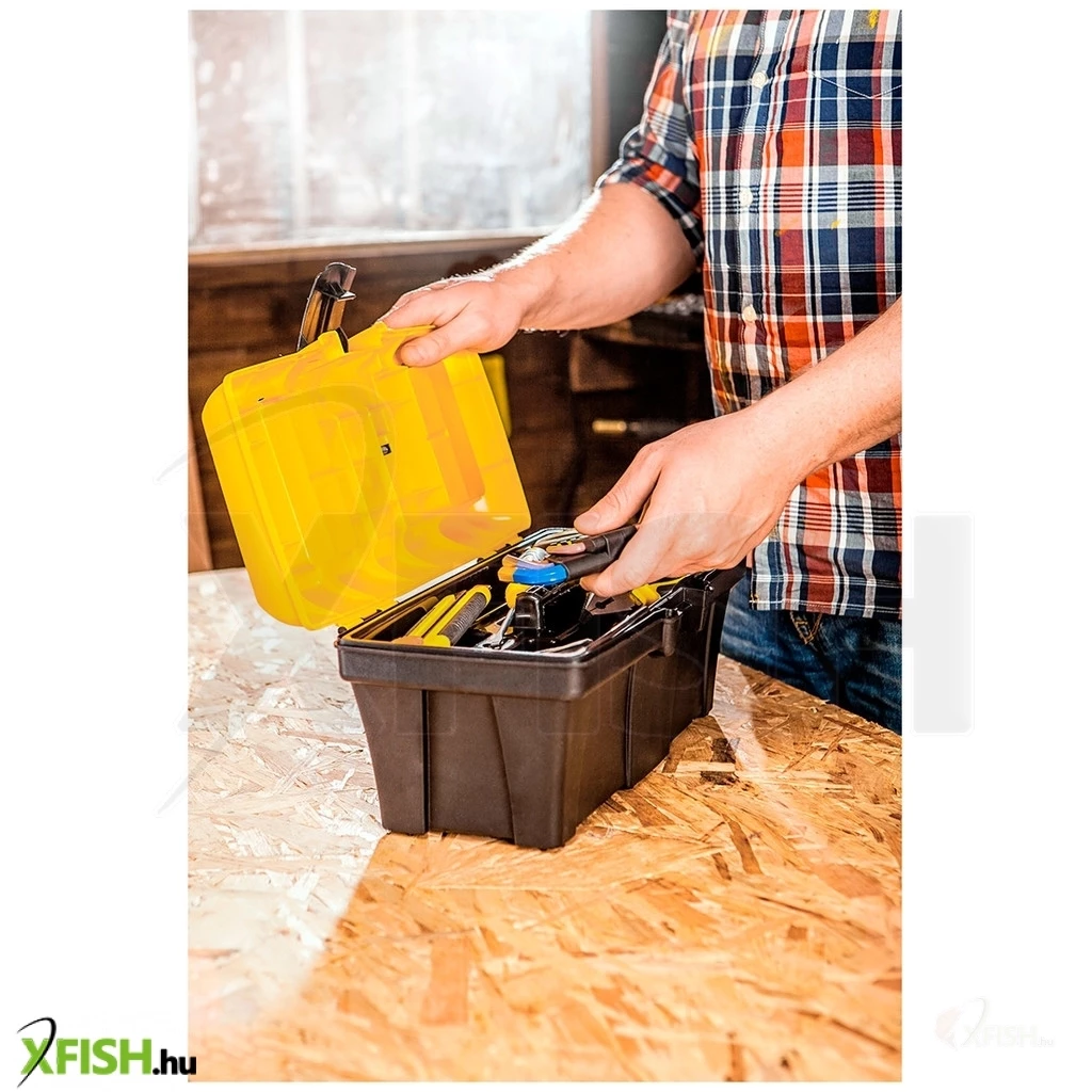 Szerszámosláda, rendeződobozokkal, műanyag markolat, műanyag csatok