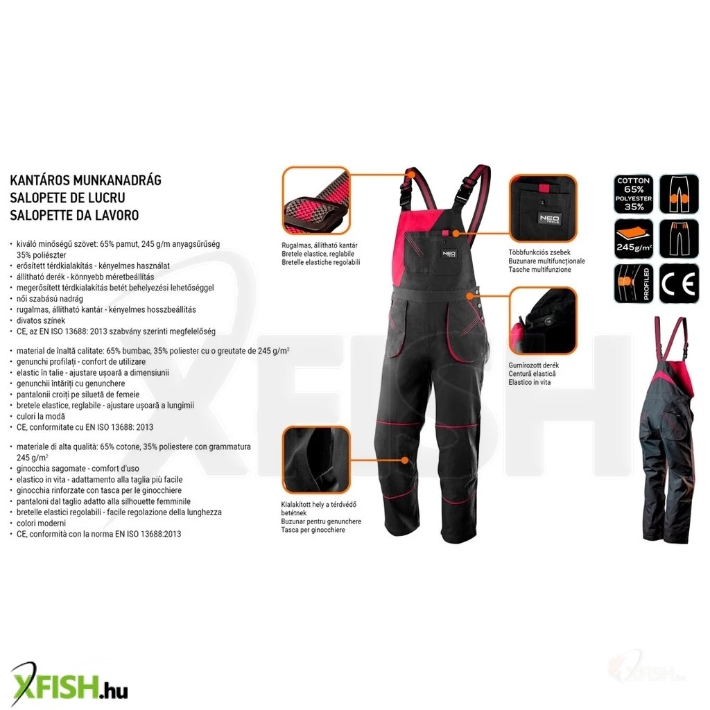 A Neotools női kantáros munkanadrág ideális választás minden horgász számára, aki nemcsak kényelmes, hanem tartós védőöltözetet keres. Ez a munkanadrág kiváló arányban ötvözi a hagyományos pamut puhaságát és a poliészter strapabírását, hogy maximális kényelmet és hosszú élettartamot biztosítson. A 245 g/m2 anyagsűrűség különösen erős szerkezetet ad, így ellenáll a mindennapi viseletből adódó kopásnak és szakadásnak.