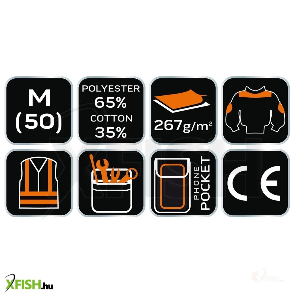 A kabát dizájnjának fontos eleme a vékony fényvisszaverő csíkok, melyek a hátsó részen kaptak helyet, ezek fokozott láthatóságot biztosítanak gyenge fényviszonyok között, növelve ezzel a biztonságot a szürkület idején végzett munkálatok során. A termék megfelel a CE és az EN ISO 13688:2013 európai biztonsági szabványoknak, így biztos lehet benne, hogy választása nem csak kényelmes, hanem teljesen biztonságos is.
