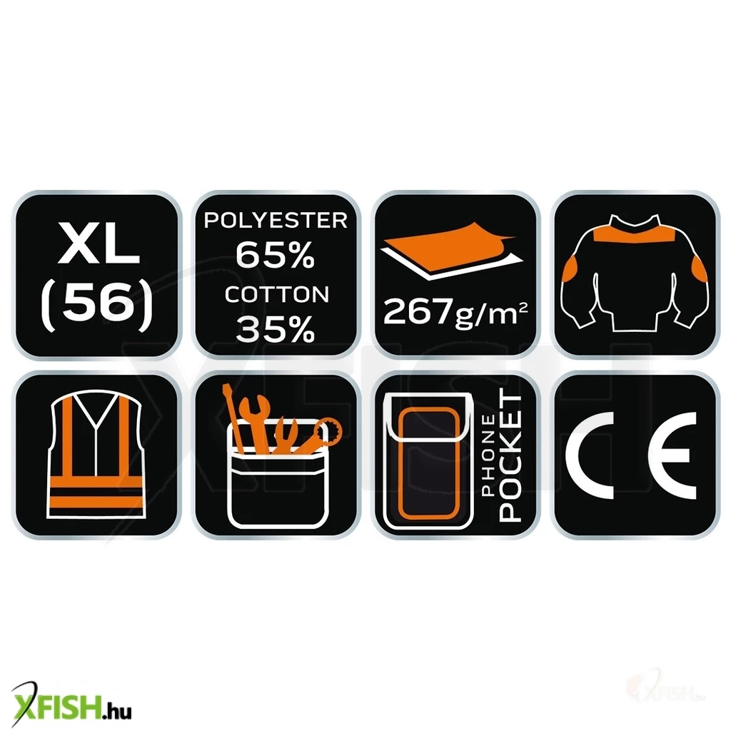 Az erősített zsebek praktikus tárolást biztosítanak a kisebb eszközök és személyes tárgyak számára, amelyeknek kéznél kell lenniük a munka során. A biztonsági előírásoknak megfelelően a hát részen elhelyezett fényvisszaverő csíkok növelik a láthatóságot gyengébb fényviszonyok között vagy éjszakai munkavégzés során. Ez fontos szempont lehet azok számára, akik kültéri környezetben dolgoznak, ahol az extra láthatóság kulcsfontosságú a biztonság érdekében.