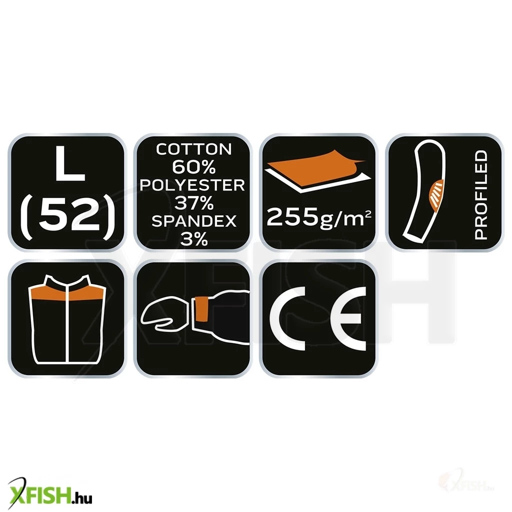 A kabát 60% pamutból, 37% poliészterből és 3% elasztánból készül, ami optimális egyensúlyt biztosít a légáteresztés, kényelem és rugalmasság között. A pamut természetes anyaga lágy tapintást és kellemes viseletet garantál egész nap, míg a poliészter hozzájárul a kabát tartósságához és ellenállóképességéhez. Az elasztán jelenléte pedig fokozott mozgásszabadságot biztosít, így a kabát ideális választás azok számára, akik aktívan dolgoznak a terepen.