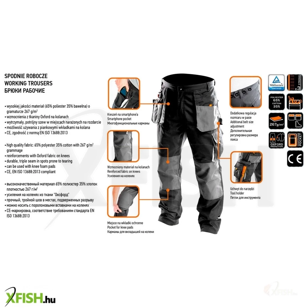 Az oxford anyagú erősítések különösen strapabíróvá teszik a nadrágot, ami kiváló választás a zord kültéri munkákhoz vagy horgászathoz. A további erősített zsebek és a tripla varrások garantálják, hogy ez a munkásnadrág akár a legdurvább munkakörnyezetekben is helytálljon, miközben a szükséges szerszámokat és eszközöket biztonságosan és kényelmesen tárolhatja a zsebekben.