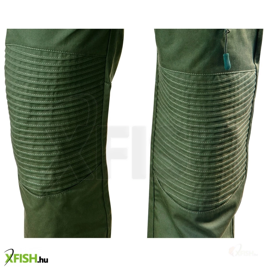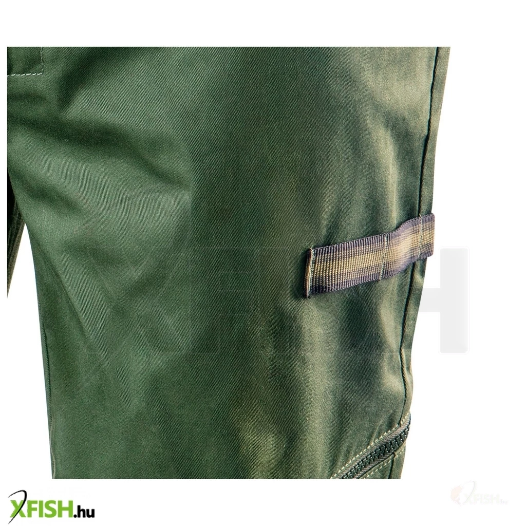 A nadrág anyaga 60 százalék pamut és 40 százalék poliészter, ami biztosítja a megfelelő szellőzést és a hosszú élettartamot. A 255 g/m2-es anyagvastagság kiváló egyensúlyt teremt a kényelem és a tartósság között, így könnyedén helytáll a mindennapi viselés során. A munkanadrág multifunkciós zsebekkel rendelkezik, amelyek lehetővé teszik, hogy minden szükséges eszköz és kiegészítő kéznél legyen, így a horgászat még élvezetesebb és szervezettebb lehet.