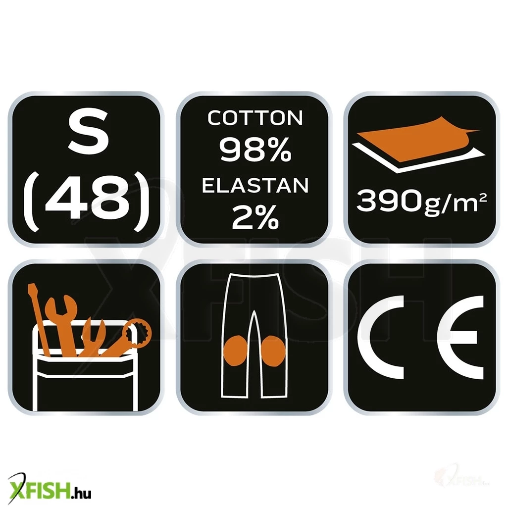 Neotools farmer munkásnadrág, denim, 98% pamut, térdvédő betét zsebbel, gombos oldalzsebekkel, 255 g/m2, S