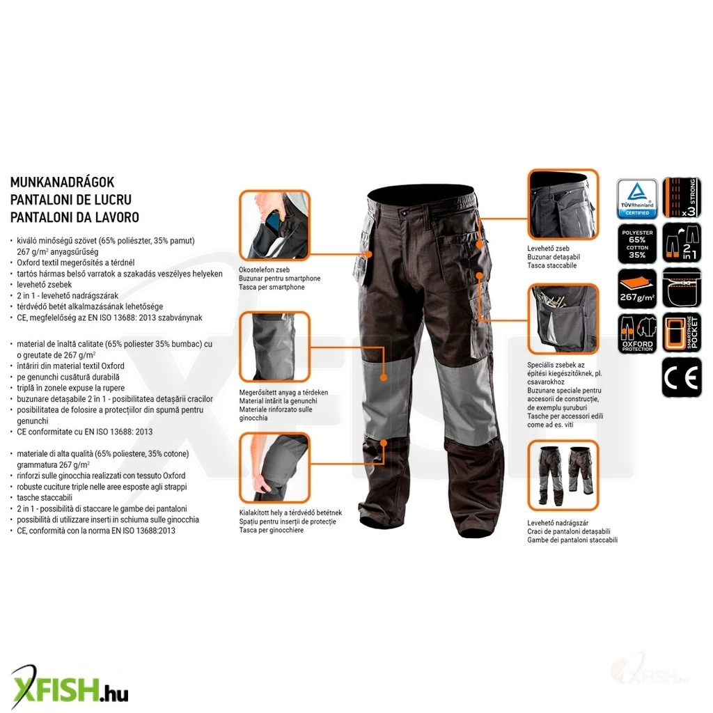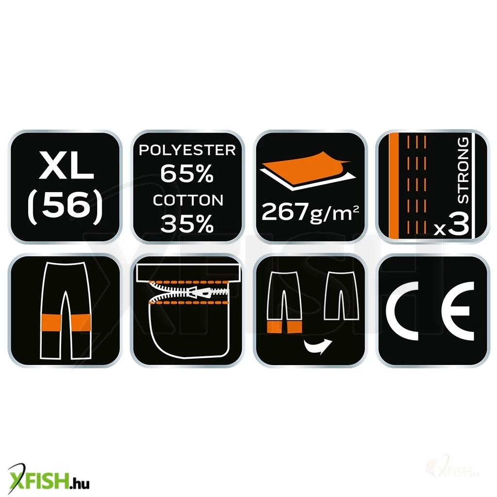A Neotools munkásnadrág kiváló választás profi és hobbihorgászok számára, akik hosszú napokat töltenek a szabadban, hiszen egyszerre nyújt kényelmet és védi meg viselőjét. Az XL/56-os méretű nadrág tervezése során ügyeltek a tartósságra és a praktikumra. A 65% poliészter és 35% pamut összetételű anyag könnyided és strapabíró, a 267 g/m2 súly pedig elegendő rugalmasságot biztosít a szabad mozgás érdekében, ugyanakkor megfelelően ellenáll a kopásnak.