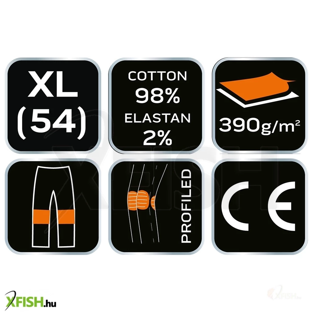 A nadrág prémium, 98% pamut anyagból készült, amely kellemes tapintású és légáteresztő, így viselése során Ön mindig kényelmesen érezheti magát. A 255 g/m2 sűrűségű szövet biztosítja a tartósságot és ellenállóképességet, amely elengedhetetlen a hosszú távú, intenzív használathoz. A klasszikus fekete szín eleganciát és professzionalizmust sugároz, és könnyen kombinálható más ruhadarabokkal is.