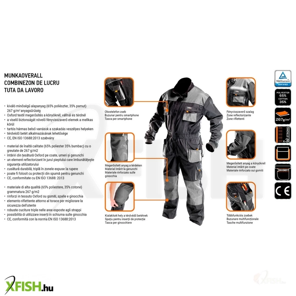 A Neotools overall kiváló választás azoknak, akik egy strapabíró és kényelmes munkaruhát keresnek. Ezt a terméket a tartósság és a praktikum jegyében tervezték, így ideális választás horgászathoz és egyéb kültéri tevékenységekhez. A termék kiváló minőségű alapanyagokból készült, a 35% pamut és 65% poliészter keveréke kényelmes viseletet biztosít. Az overall anyagának 267 g/m² vastagsága elég erőt és tartósságot ad, hogy ellenálljon a mindennapi használat során felmerülő kopásnak és terhelésnek.
