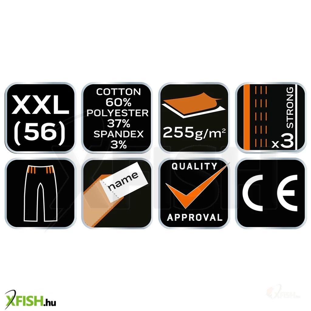 A magas pamuttartalom puha és légáteresztő, míg a poliészter szálak növelik az anyag ellenálló képességét az időjárás és a hosszan tartó használat során. Az elasztán hozzáadásának köszönhetően a nadrág rugalmas, és biztosítja a mozgásszabadságot, ami elengedhetetlen a dinamikus horgászmódszer alkalmazása közben. Az XXL méret gondoskodik arról, hogy mindenki megtalálja a számára megfelelő viseletet, amely tökéletesen illeszkedik az alkatához és kényelmesen hordható hosszú, akár egész napos horgászat során is.