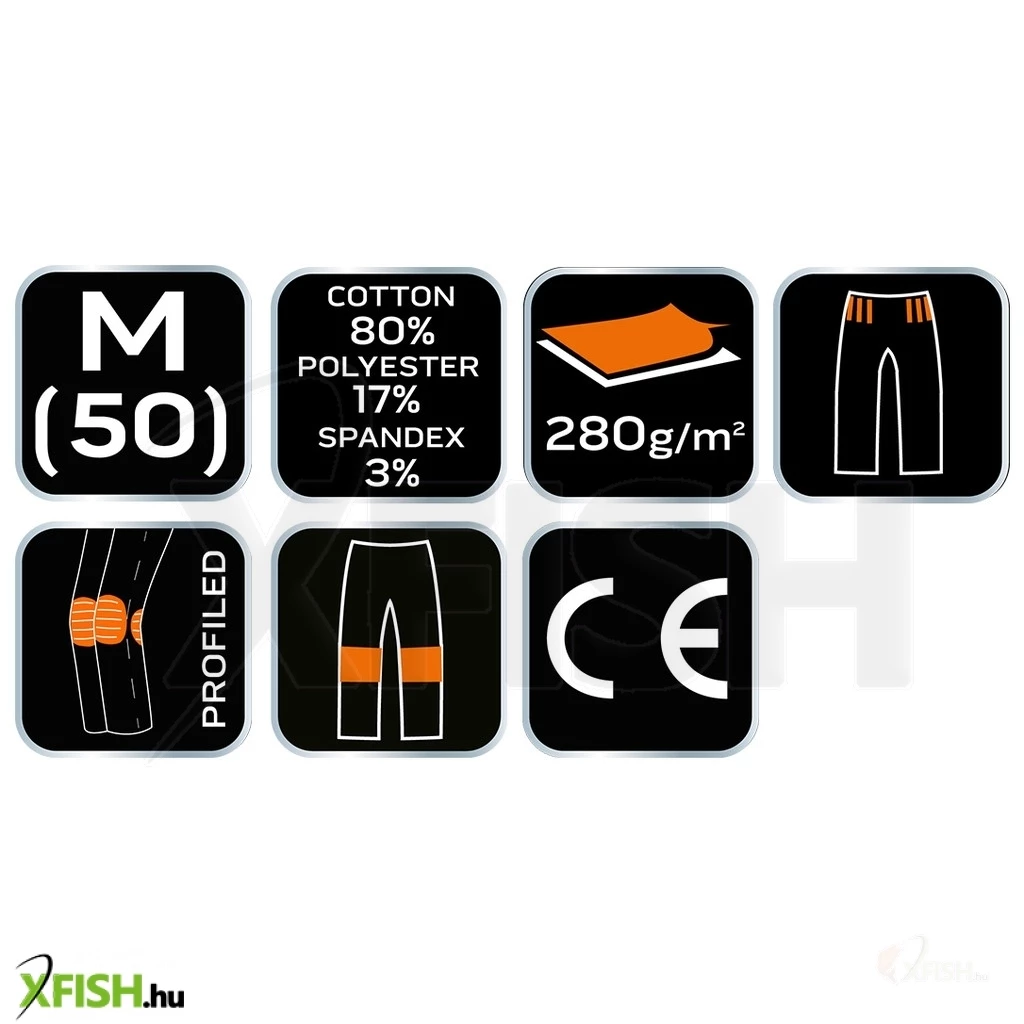 A nadrág anyaga 80% pamut, ami biztosítja a kiváló szellőzést és kényelmes viseletet, míg a maradék anyaghányad olyan tartós szövetet jelent, amely ellenáll a külső behatásoknak és az időjárási körülmények változásainak. A strapabíró kivitel különösen előnyös azok számára, akik sok időt töltenek a szabadban és fokozottabb védelemre van szükségük.