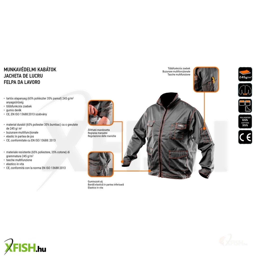 Neotools munkavédelmi kabát, basic, xl/56, 35% pamut, 65% polyester, többfunkciós zsebek, gumírozott derék, ce en341