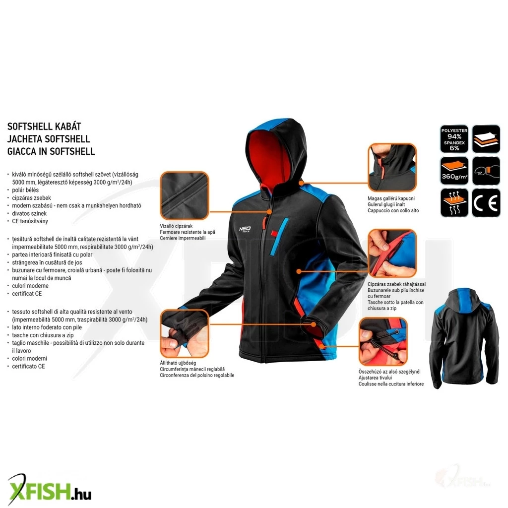 Neotools softshell munkavédelmi kabát, víz- és szélálló, hd+, vízállóság5000mm, lélegző3000g/m2/24h, XL