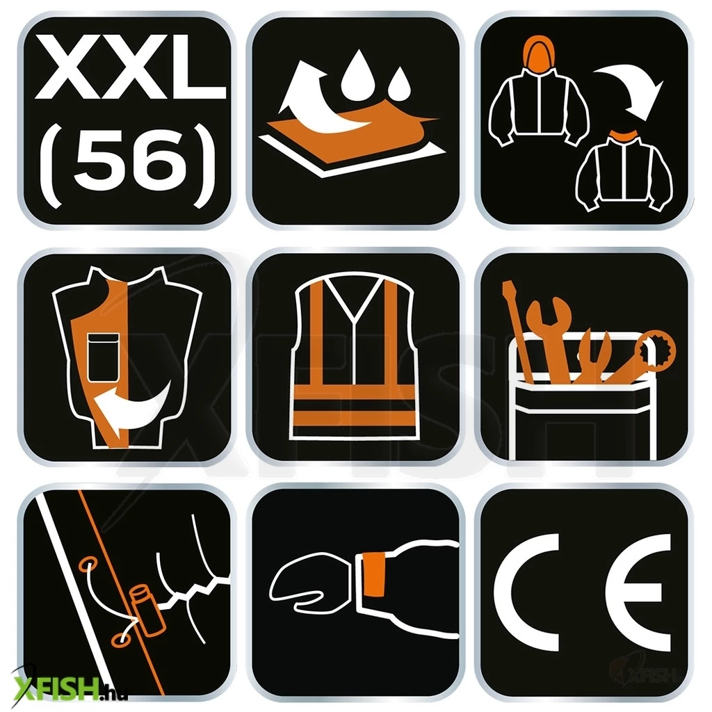 - Tulajdonságok: Vízhatlan, fényvisszaverő elemek, meleg bélés, levehető csuklya, magas álló gallér, belső rugalmas mandzsetták