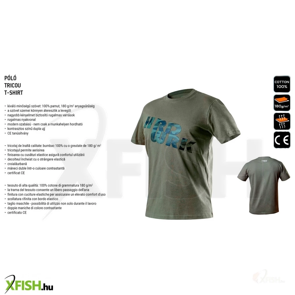 A póló olíva zöld színe és exkluzív CAMO mintázata remekül beilleszkedik a természetközeli környezetbe, miközben a "HRD WRK" feliratnyomat modern megjelenést kölcsönöz a viselőjének. A póló nem csupán megjelenésében nyújt többet, hanem a biztonság terén is, hiszen CE tanúsítvánnyal rendelkezik, amely igazolja, hogy megfelel a szigorú európai szabványoknak.