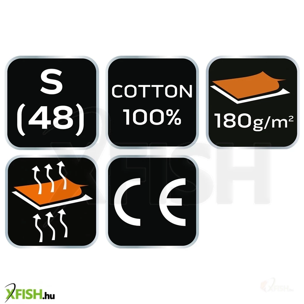 A póló kiváló minőségű, 100% pamut alapanyagból készült, amely 180g/m2 vastagságának köszönhetően tartós viseletet garantál, miközben puha tapintása egész napos kényelmet nyújt. A természetes pamut szövet kiváló légáteresztő képességgel rendelkezik, így a meleg napokon is hűvösen és szárazon tartja a testet, megakadályozva a túlzott izzadást, ami különösen fontos a horgászat során.