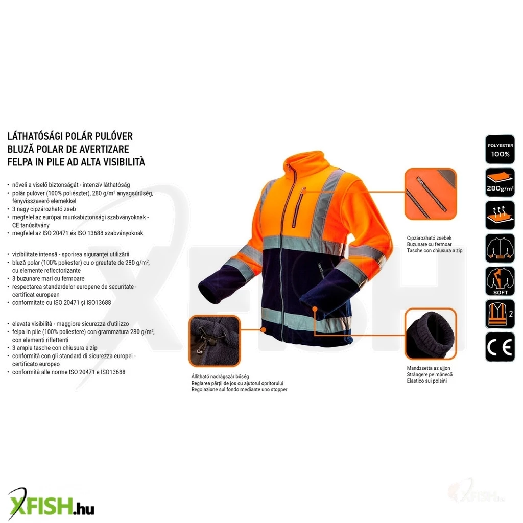 A Neotools láthatósági polár munkavédelmi kabát a horgászok számára ideális választást jelent, amikor a kényelem és a biztonság találkozik. Ez a kiváló minőségű, narancssárga polár kabát a védőfelszerelés kategóriájába tartozik, amely a hideg napokon is kellemes hőérzetet biztosít. Az 280 g/m² sűrűségű polár anyag nemcsak melegen tart, de az EN ISO 20471 szabvány szerinti 2-es osztályba tartozó intenzív láthatóságot is garantálja.