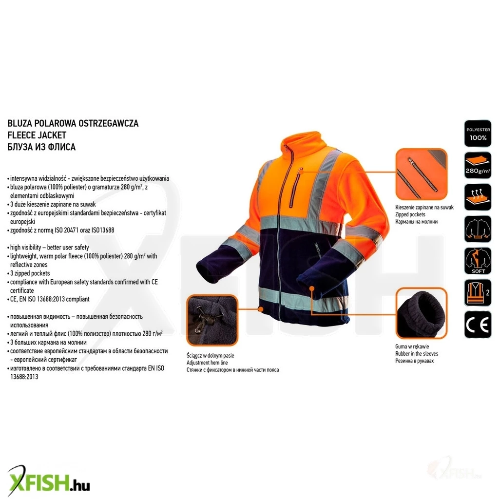 A Neotools láthatósági polár munkavédelmi kabát tökéletes választás azok számára, akik nagy hangsúlyt fektetnek a biztonságra és kényelmre a munkavégzés során. Ez a narancsszínű munkadzseki intenzív láthatóságot biztosít, köszönhetően az EN ISO 20471 szabvány szerinti 2. osztályú minősítésének. A kabátot kiváló minőségű, 280 g/m²-es polár anyagból készítették, amely nemcsak tartós, de meleg viseletet is biztosít hideg időben. A praktikumot szem előtt tartva, három zippzáras zsebbel látták el, így a mindennapi munkához szükséges eszközöket mindig kéznél tarthatja. A szennyeződéseknek leginkább kitett helyeken sötét anyagot használtak, így a kabát még intenzív igénybevétel esetén is megőrzi esztétikus megjelenését. A termék rendelkezik CE tanúsítvánnyal, valamint megfelel az EN ISO 13688:2015 szabvány követelményeinek, garantálva a különleges komfortot és védelmet.