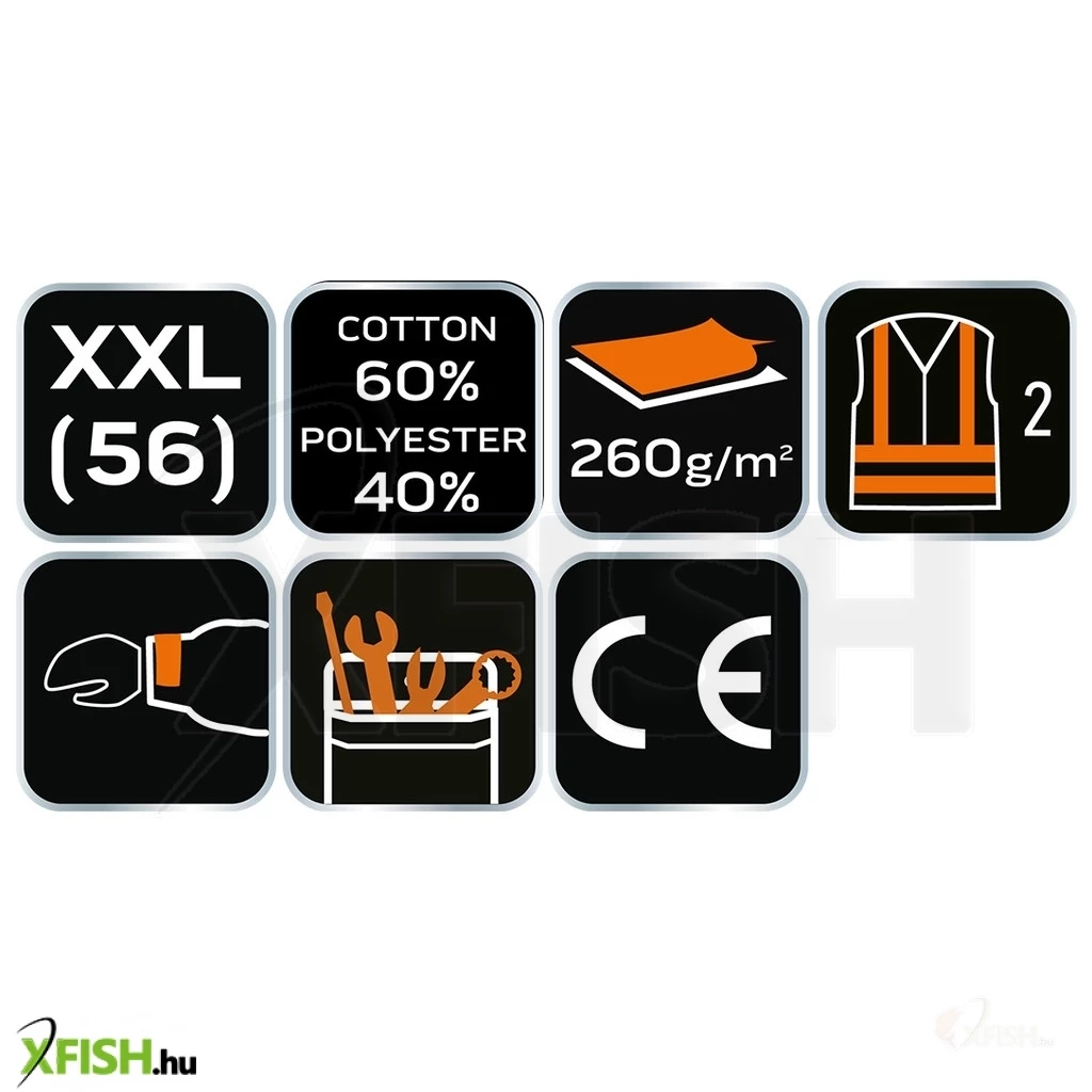 A kabát anyaga 60% pamutból és 40% poliészterből készült, ami 260 g/m² grammát jelent, ezzel biztosítva a tartósságot és strapabírást. A termék megfelel az EN ISO 20471:2013 szabványnak, amit a CE tanúsítvány is igazol. Az elérhető méretválaszték S-től XXXL-ig terjed, így mindenki megtalálhatja a számára megfelelő méretet.