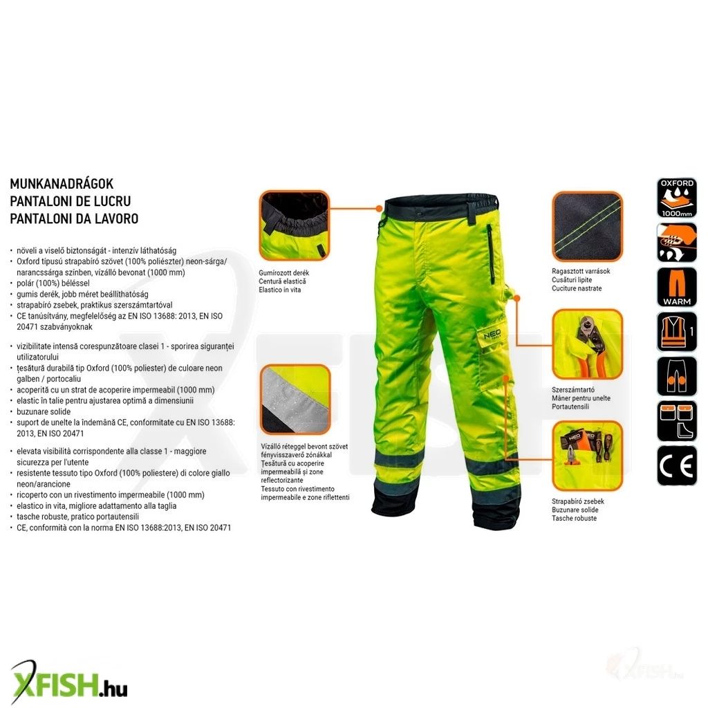 A Neotools láthatósági softshell munkásnadrág az ideális választás mindazoknak, akik a maximális biztonságra és kényelemre törekednek munkavégzés közben. Ez a citromsárga színű nadrág nemcsak hogy feltűnő, de az EN ISO 20471 szabvány szerinti 1. osztályú láthatóságot is biztosít, ami elengedhetetlen a veszélyes környezetekben való munkavégzés során. Az Oxford 300D anyagból készült nadrág tartósságot és strapabíróságot kínál, miközben a poliészter bélés gondoskodik a viselő maximális komfortérzetéről.