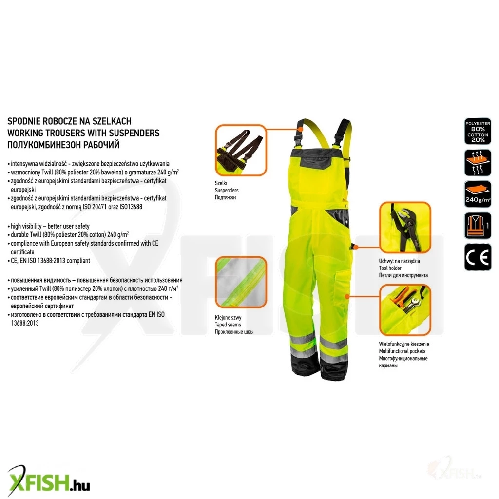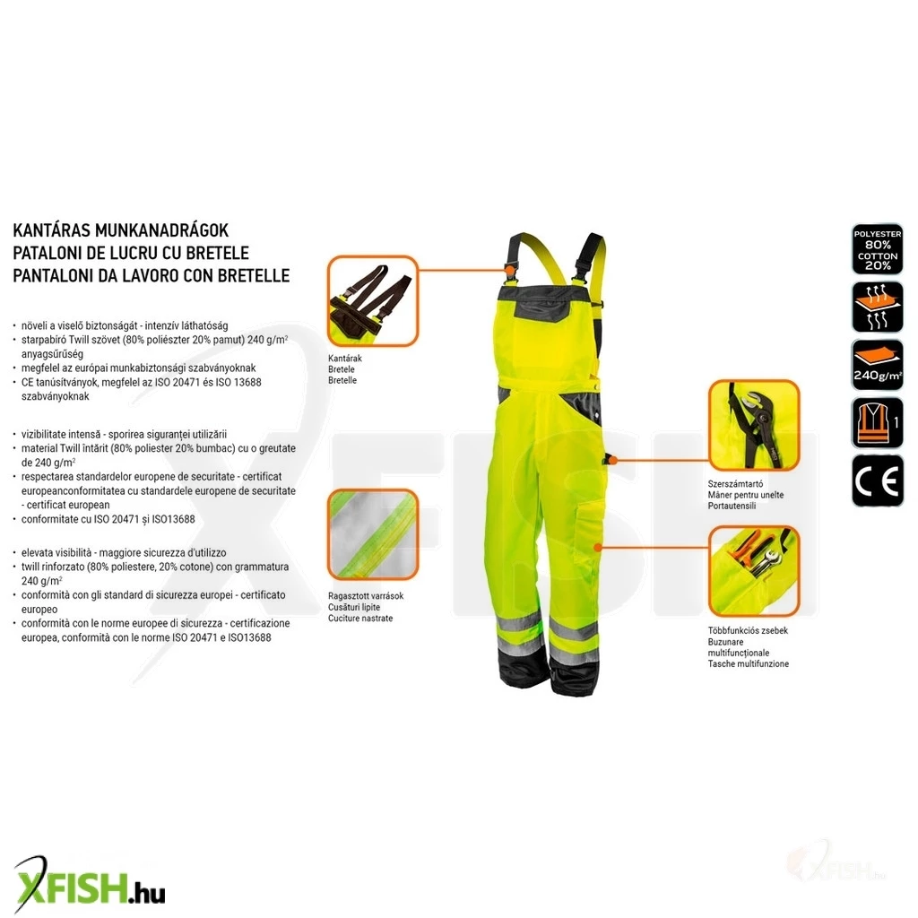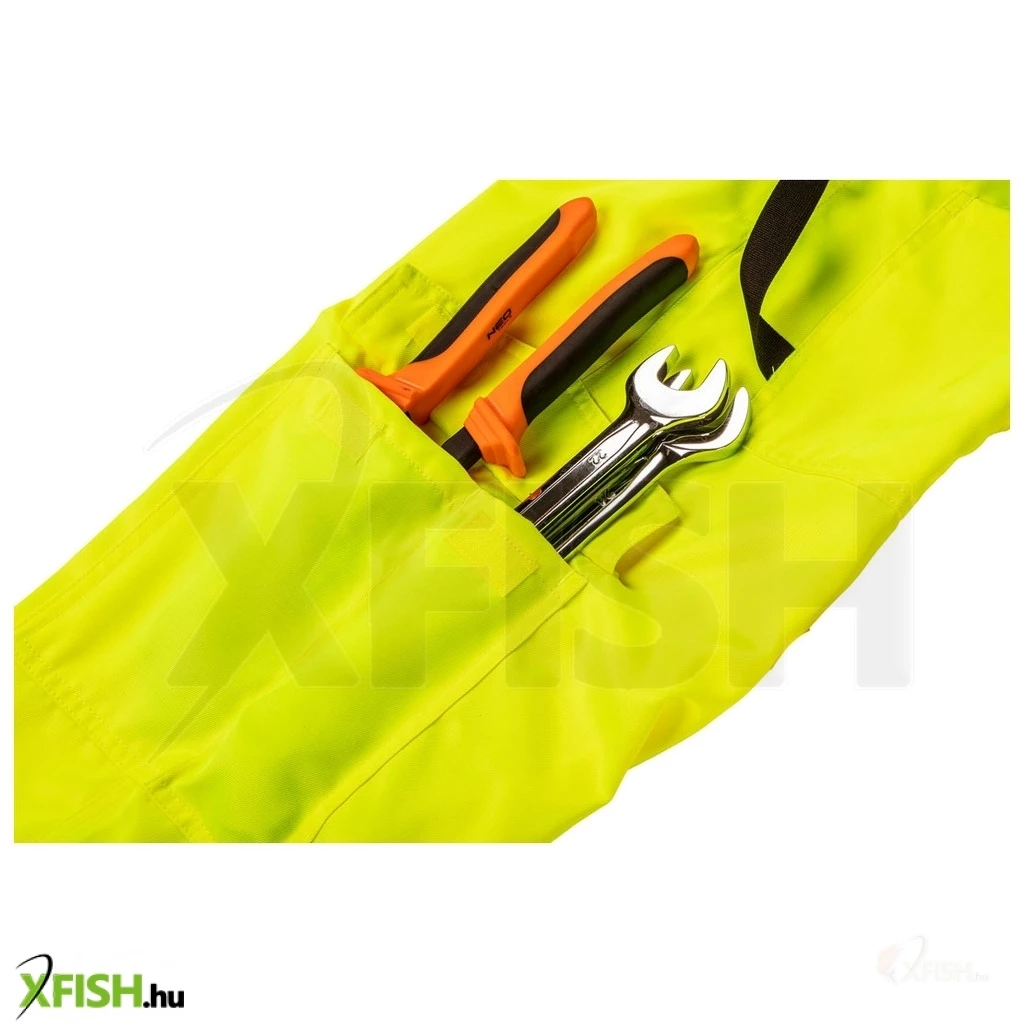 Neotools láthatósági kantáros munkanadrág, lélegző, 240gsm, polyester+pamut, sárga, S