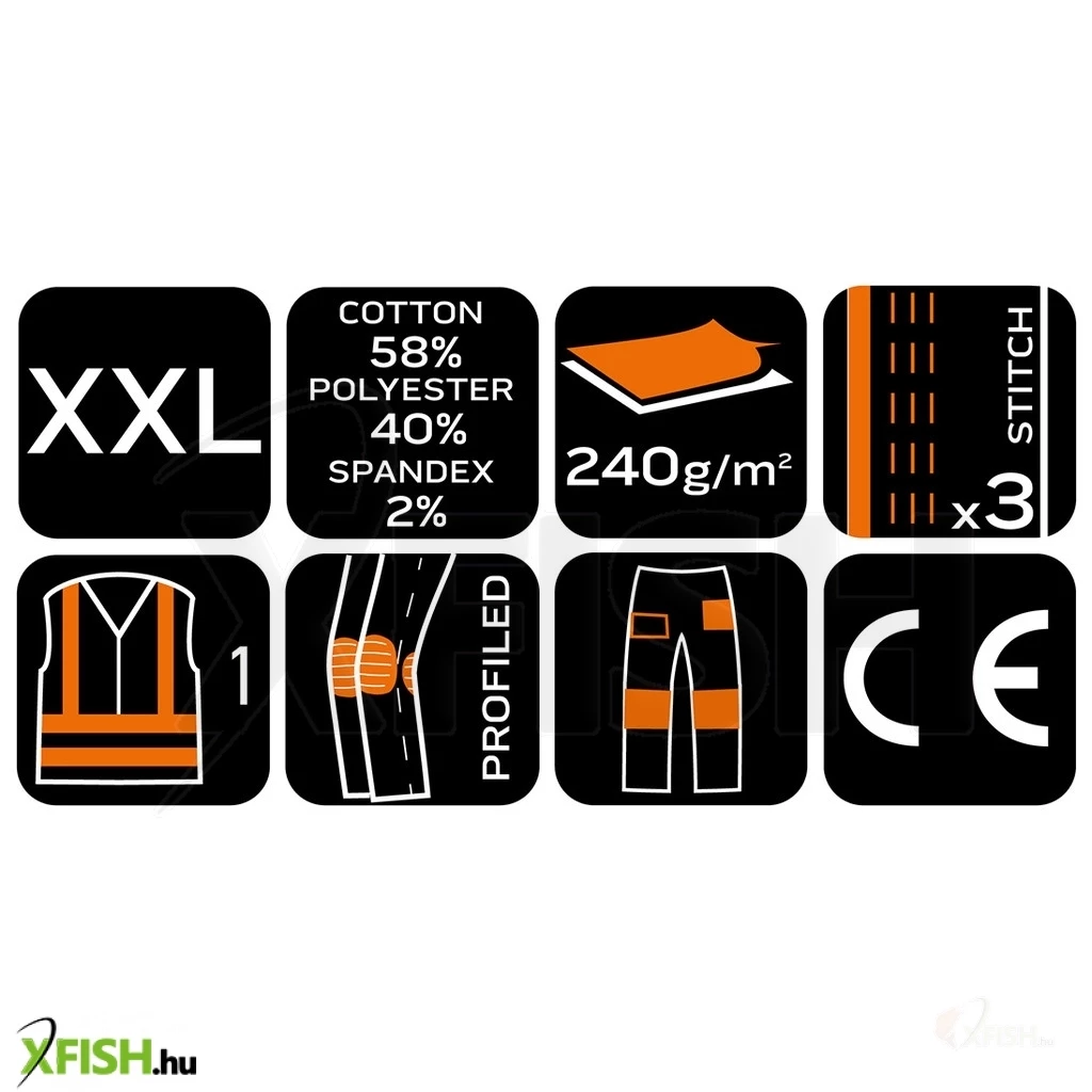 A nadrág minőségi matériája és megtervezett szabása, amely kifejezetten a fizikai munkát végzők igényeire lett szabva, garantálja, hogy a nap bármely szakában komfortosnak érezze magát a viselője. A termék mérete az XXL kategóriába esik, ami biztosítja, hogy a nagyobb méretekkel rendelkező egyének is megtalálják a számukra megfelelőt. Ezen láthatósági munkásnadrágot bátran ajánljuk mindazoknak, akik számára elengedhetetlen a biztonság, a praktikusság, és a modern megjelenés a munkavégzéshez.