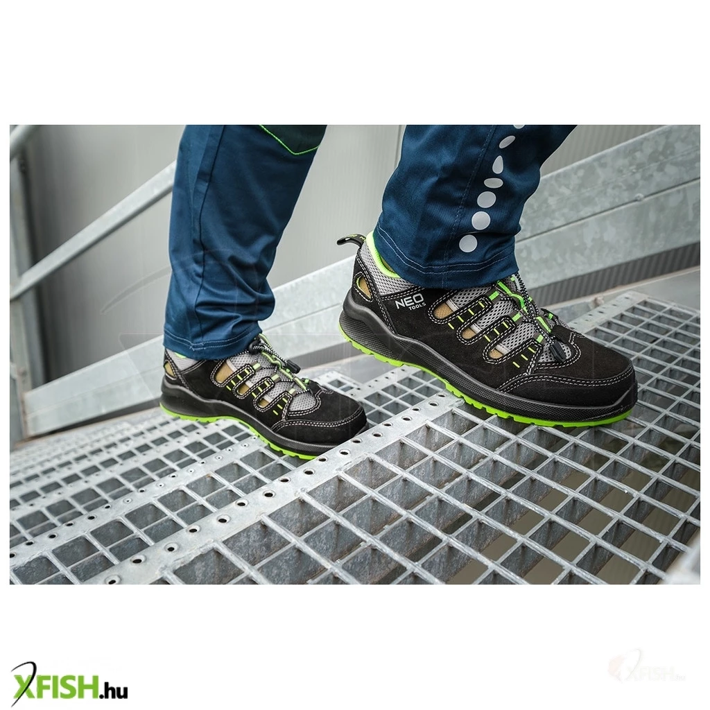 A NEO TOOLS munkaszandál különlegessége az acél orrmerevítés és a szúrásgátló acél talpbetét, amelyek hatékonyan védik a lábat a fizikai sérülésektől. A modell az S1P SR kategória követelményeinek megfelelően készült, ami a csúszásállóságot is garantálja különböző bevonatokkal ellátott talajokon. A csúszásmentes talp kihangsúlyozza a biztonságot, miközben az ütéscsillapító rendszer és a beépített sarok további komfortérzetet nyújtanak mindennapos használat során.