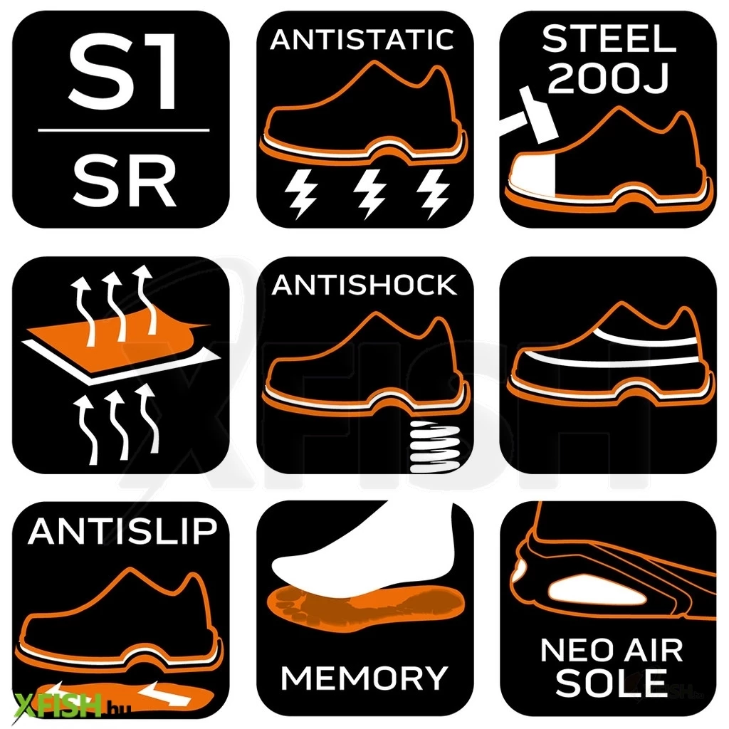 A Neotools munkavédelmi cipő, s1 sr, fekete-narancs, neo air, acélbetéttel, légpárnás talppal, fényvisszaverő elemekkel, 42 készletinformációihoz