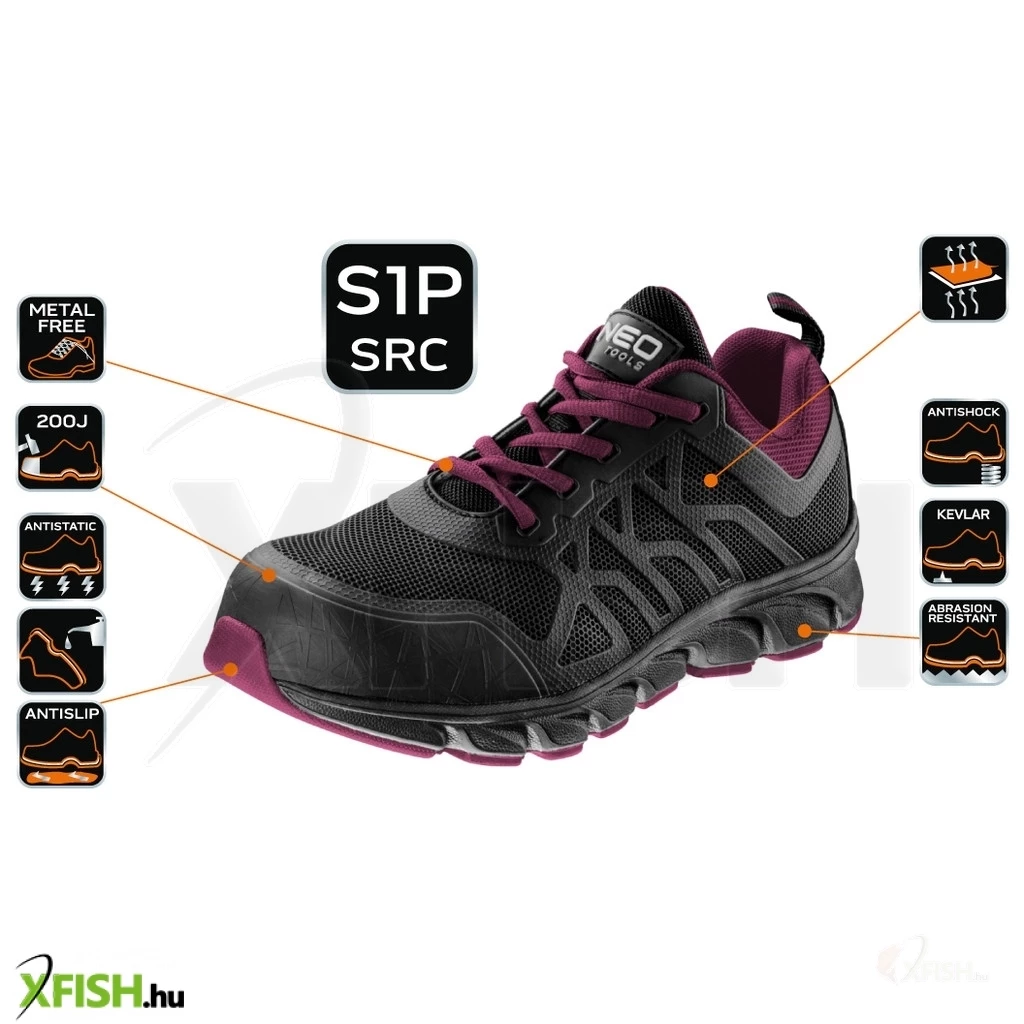 A Neotools női munkavédelmi cipője egyesíti a modern dizájnt a kiváló biztonsági funkciókkal, így tökéletes választás a dolgozó nők számára, akik nem csak hatékony, hanem esztétikailag is vonzó lábbelire vágynak. Az S1P SRC kategória azt jelenti, hogy a cipő nemcsak a hagyományos munkahelyi veszélyek, mint a rázkódás vagy az átszúrás ellen véd, hanem a csúszásgátló képessége révén a különféle felületeken is biztonságos mozgást tesz lehetővé. Kiemelkedő tulajdonsága, hogy fémmentes, így fémérzékelőkön való áthaladáskor is kényelmesen használható.