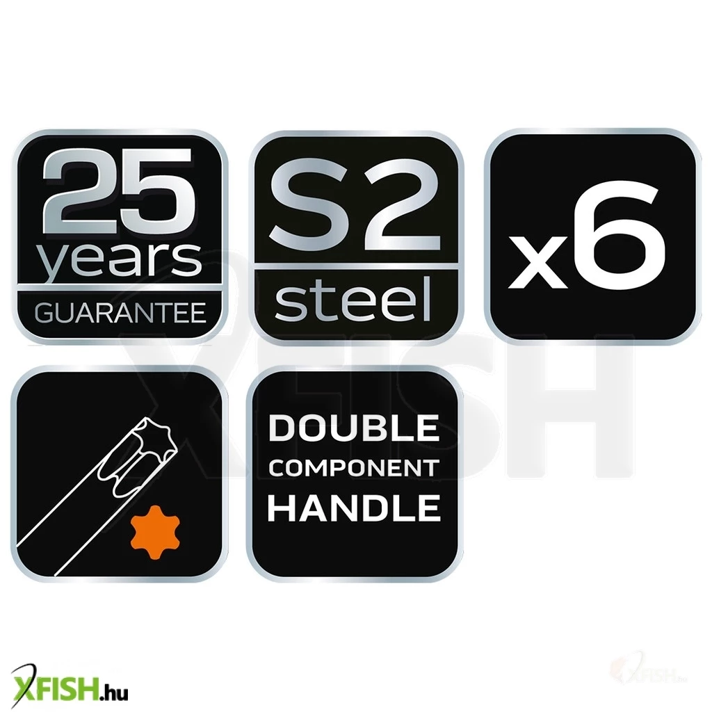 A torx csavarkulcsok a NEO márkájú műhelyszekrények alapvető kiegészítői, és 8 darab betétje révén teljeskörű megoldást nyújtanak a mindennapi szerszámozásban. A csavarkulcsok kiváló minőségű S2 acélból készültek, ami kiemelkedő tartósságot és hosszú élettartamot biztosít. A kétkomponensű fogantyúk ergonomikus kialakítása segít a kényelem növelésében, csökkentve a hosszan tartó munka során fellépő kézfáradtságot.