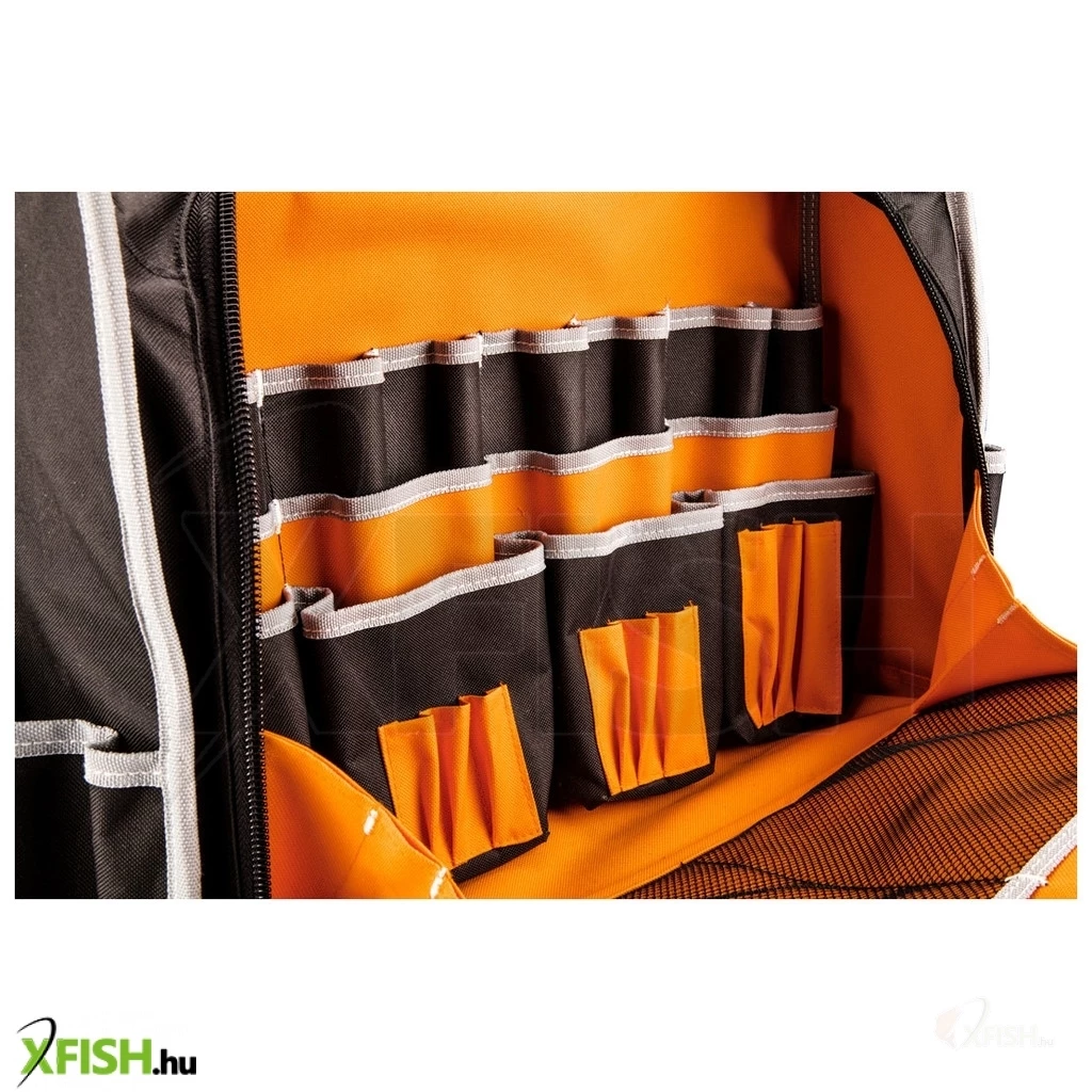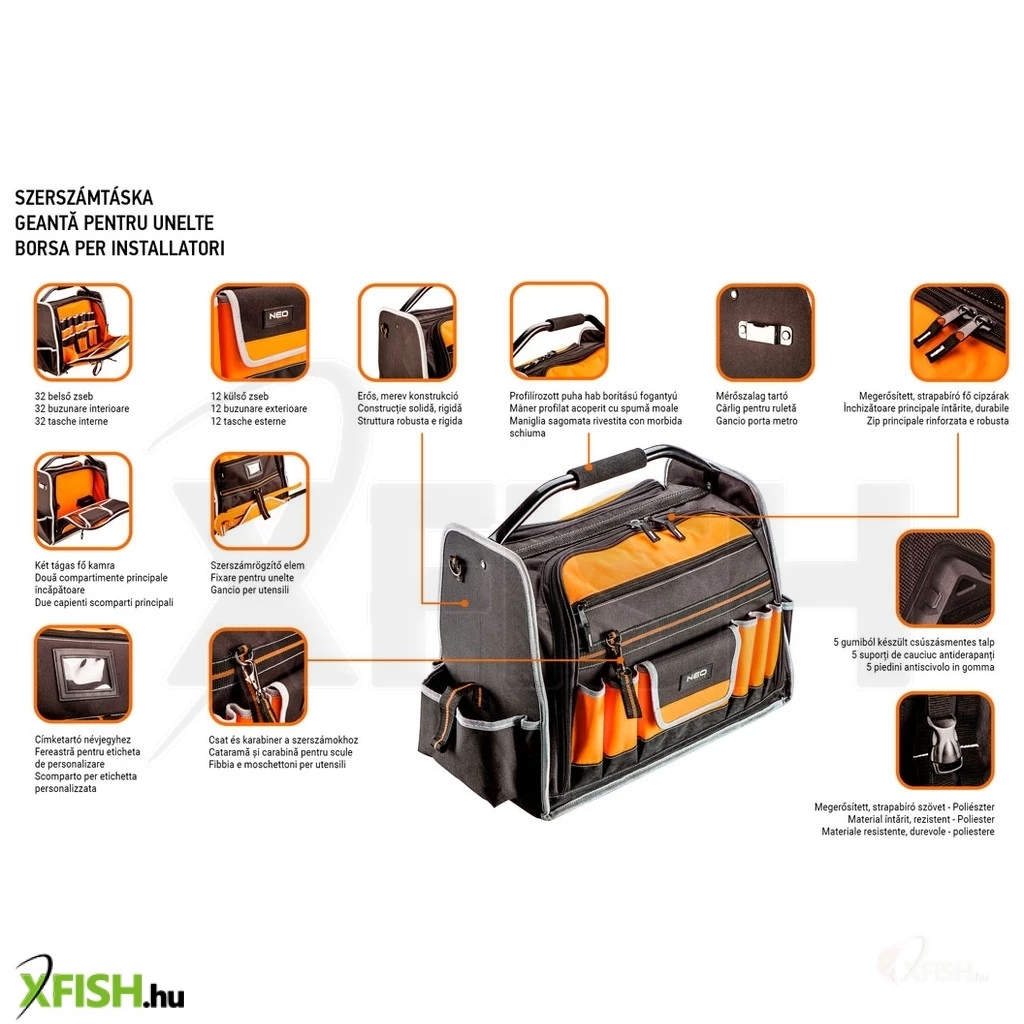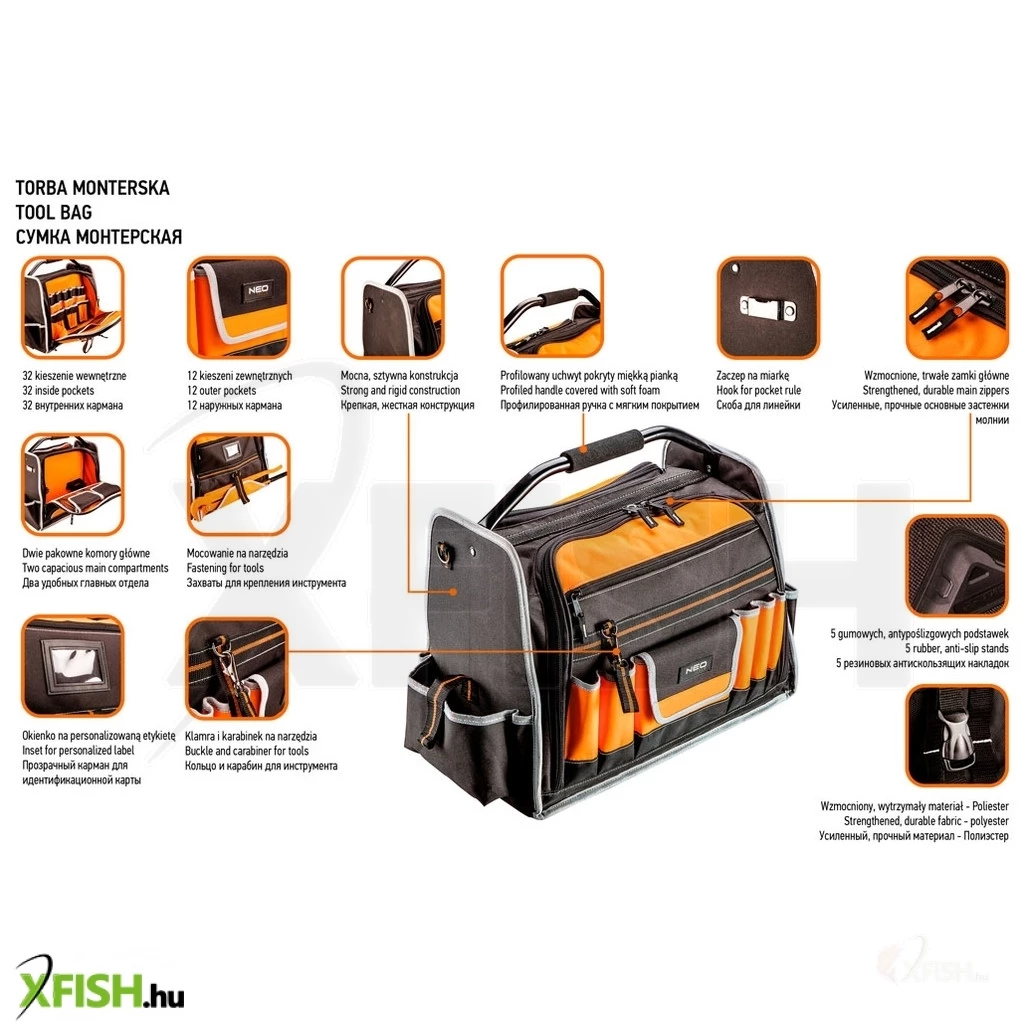Neotools szerszámtáska csőalakú fém fogantyúval, kívül12 zseb, belül32 zseb