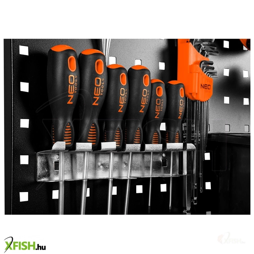 Az önállóan összeszerelendő szett részeként a falra szereléshez szükséges tipliket is tartalmazza, így az installálás gyors és egyszerű. A Neotools szerszámtartó fal kompatibilis a NEO 84-092 - 84-098 ajánlatában szereplő kampókkal, így a rendszer tovább bővíthető és testre szabható a különböző szerszámok és kiegészítők tárolására. Ez a sokoldalú panel kiváló választás mindazoknak, akik értékelik a szervezettséget és a munkaterület gyors hozzáférhetőségét.