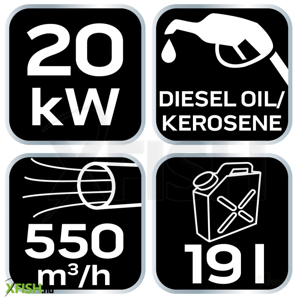 Ez a hőlégbefúvó 550 m3/h légárammal rendelkezik, ami biztosítja az egyenletes és gyors hőelosztást a nagyobb területeken is. A kerekek nélküli kialakítás ellenére, a készülék hordozhatósága megőrzött, így használata rugalmasságot és hatékonyságot kínál a különféle ipari és építőipari felhasználások során.