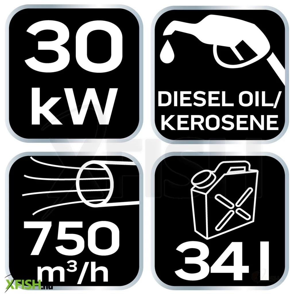 A készülék üzemeltetéséhez petróleum vagy gázolaj választható, a 34 literes tüzelőanyagtartály pedig hosszabb távú használatot tesz lehetővé anélkül, hogy gyakori utántöltésre lenne szükség. A 2,8 liter/óra fogyasztással kiváló hatékonyságot biztosít. A tüzelőtér rozsdamentes acélból készült, ventilátoros hűtéssel, hogy hosszú élettartamot és megbízható működést nyújtson.