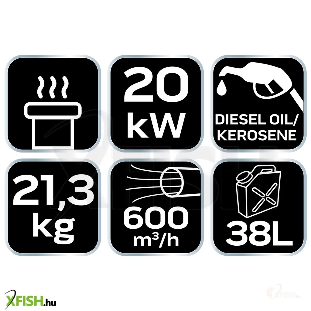 A 20 kW-os teljesítményű hőlégbefúvó figyelemreméltó, 630 m3/h légárammal működik, ami hatékonyan biztosítja a szükséges hőmennyiséget a megadott helyiségekben. A füstgázok kibocsátása nem jelent problémát, mivel a készülék speciálisan kialakított égéstermék elvezetéssel rendelkezik, ami garantálja, hogy a füstgázokat kényelmesen távolítja el a használat során, tisztán tartva a környezetet.