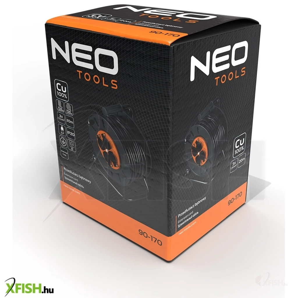KategóriákKategóriákVillamosság Kábeldob Neotools kábeldob, hosszabbító, 20m/3x1,5mm2 réz kábel, 230v, ip20, hőkioldó, műanyag dob, fém keret