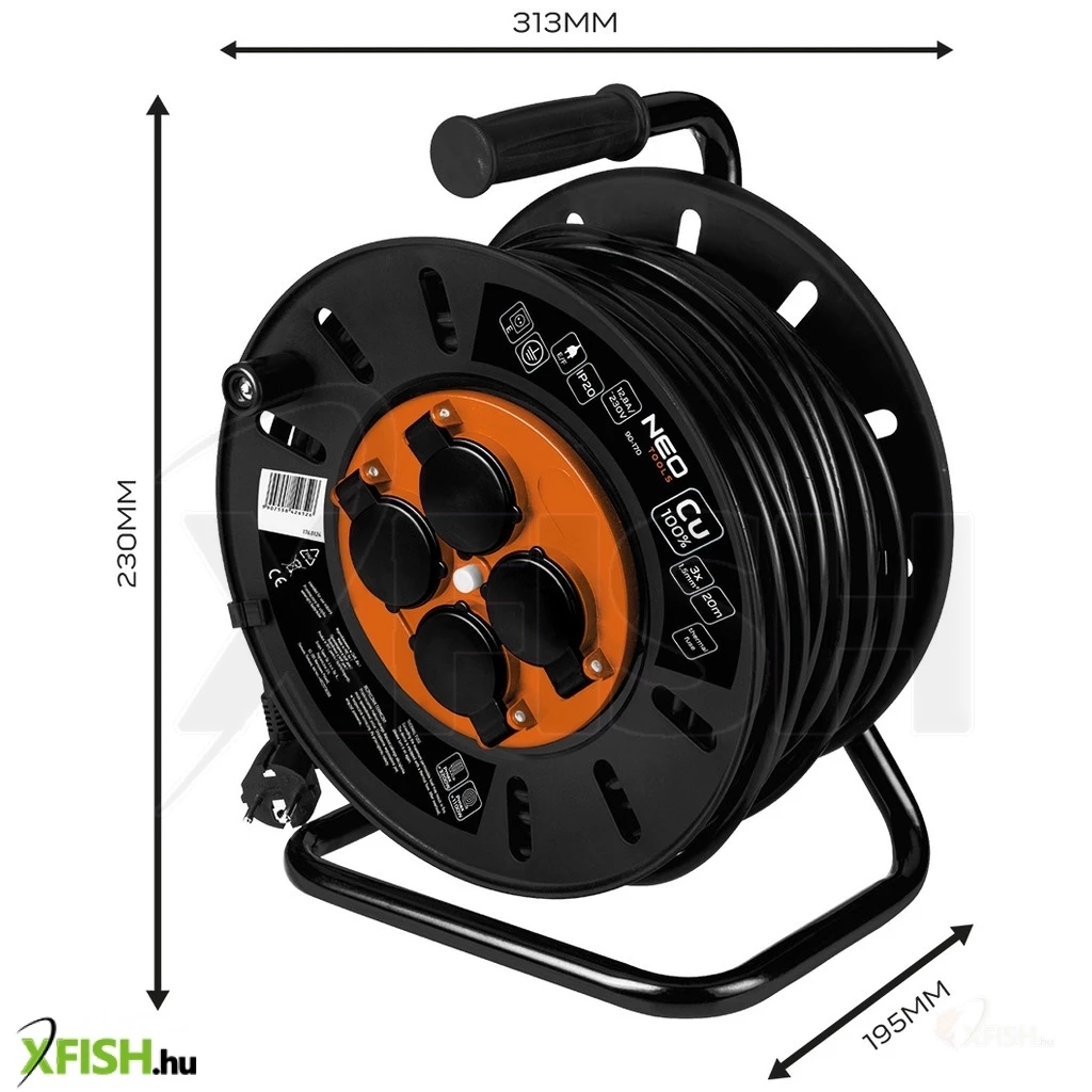 Neotools kábeldob, hosszabbító, 20m/3x1,5mm2 réz kábel, 230v, ip20, hőkioldó, műanyag dob, fém keret