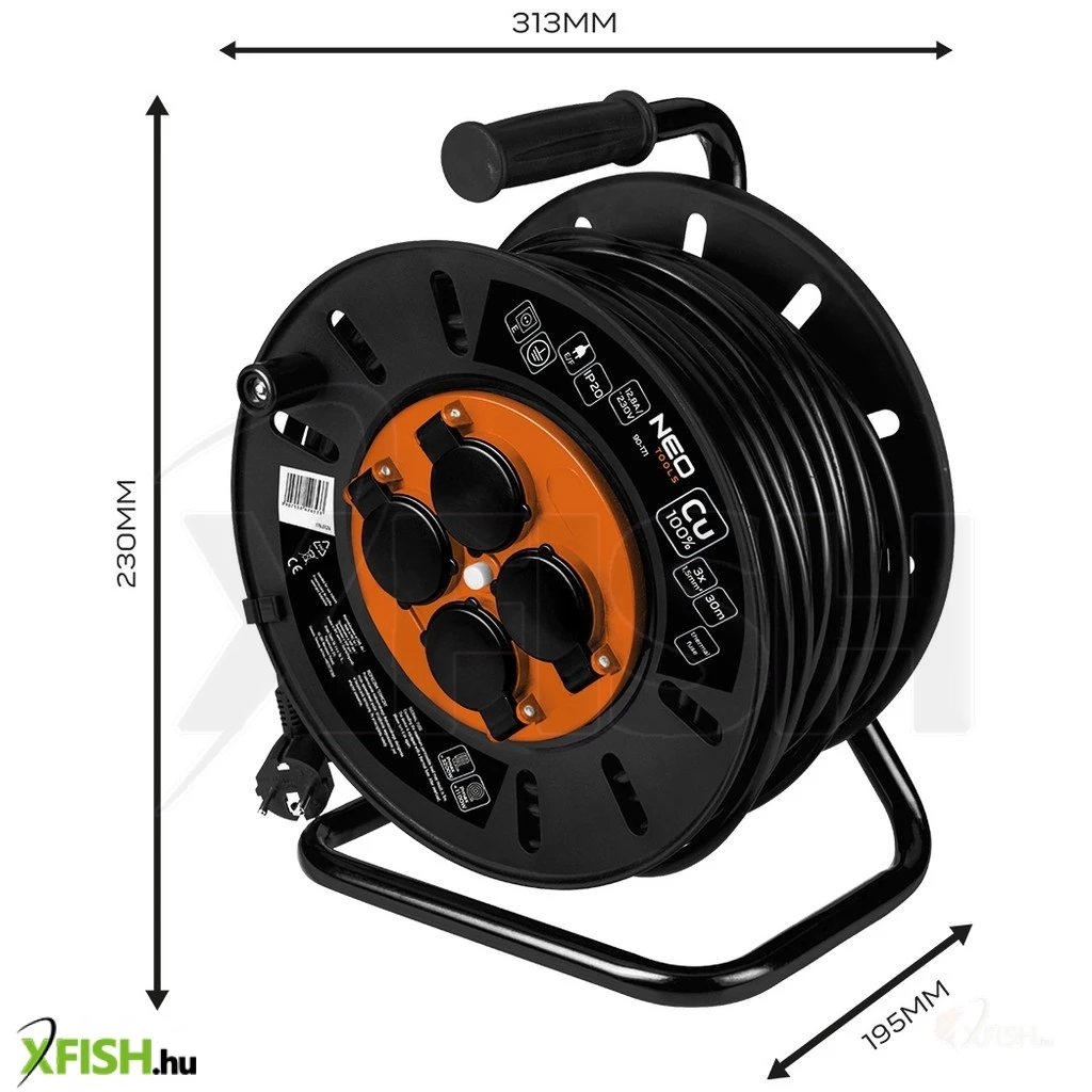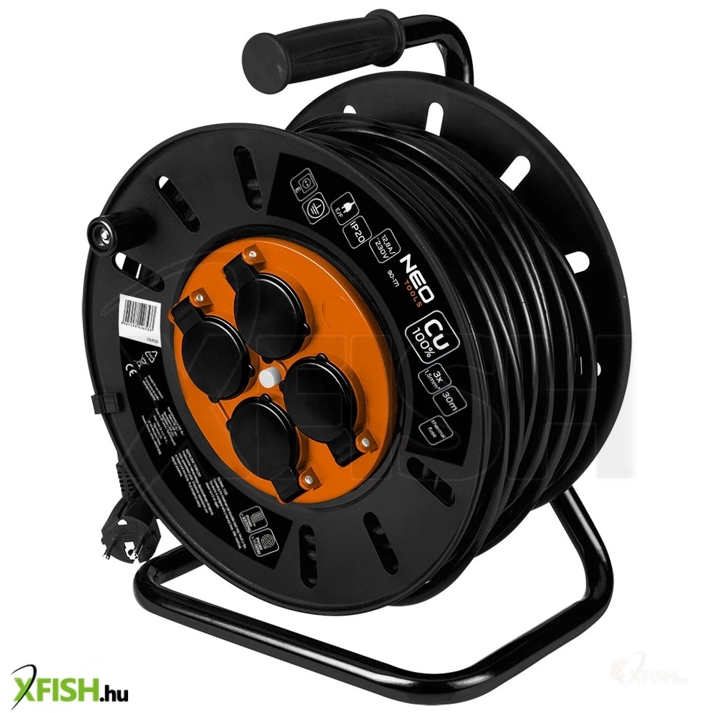 Neotools kábeldob, hosszabbító, 30m/3x1,5mm2 réz kábel, 230v, ip20, hőkioldó, műanyag dob, fém keret