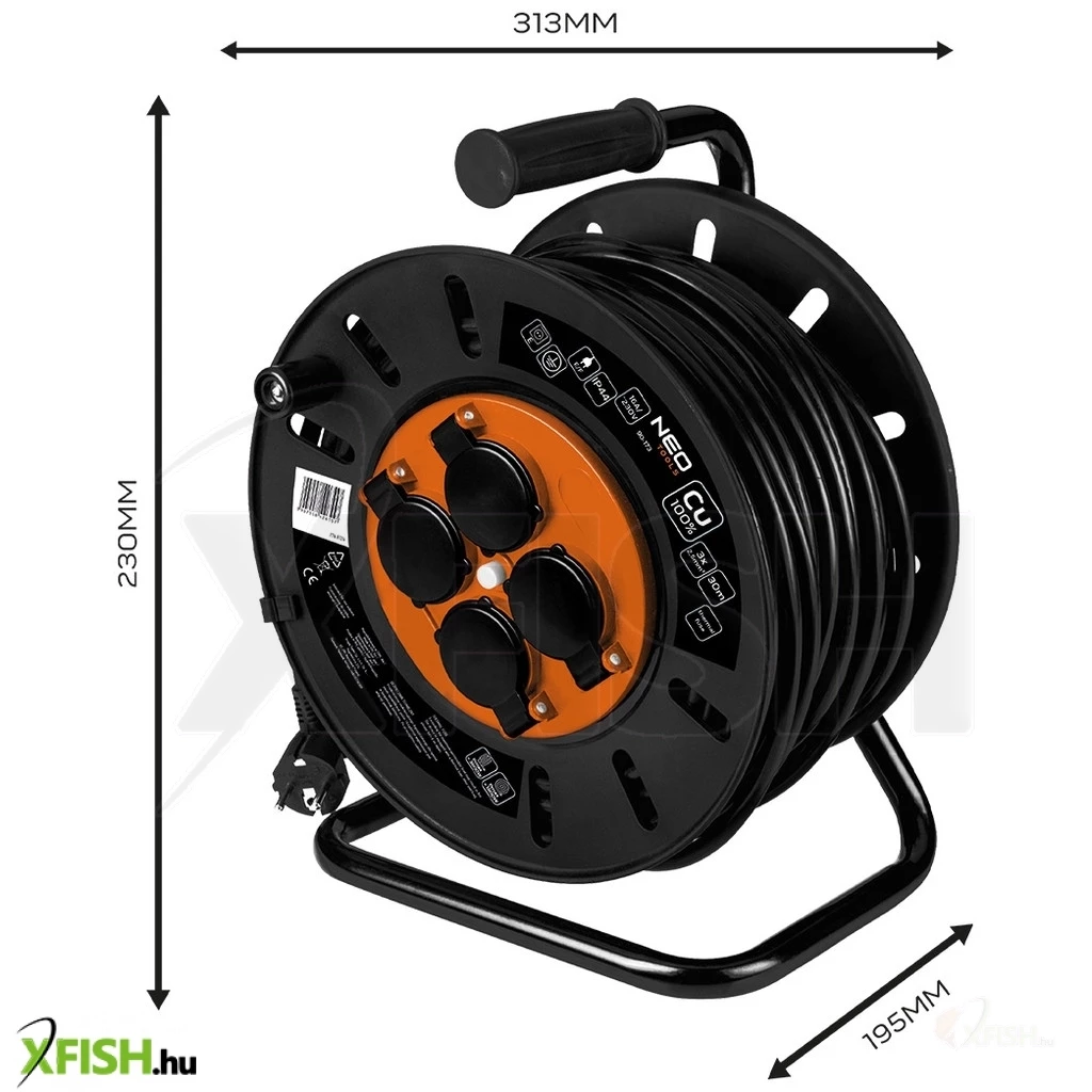 Neotools kábeldob, hosszabbító, 30m/3x2,5mm2 réz kábel, 230v, ip20, hőkioldó, műanyag dob, fém keret