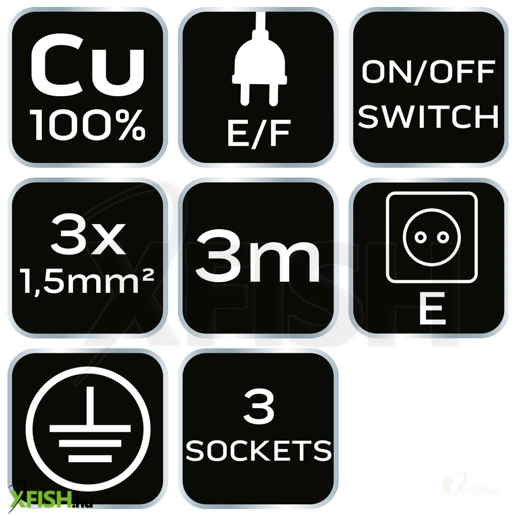 A 3x1,5mm2 keresztmetszetű kábel biztosítja a megfelelő áramvezetést és minimalizálja a túlmelegedés veszélyét, így védve az Ön és készülékei biztonságát. Ideális választás mindazok számára, akiknek fontos a megbízhatóság és a tartósság. A letisztult fehér szín és az egyszerű, de masszív kialakítás lehetővé teszi, hogy bárhol diszkréten illeszkedjen a környezetébe.