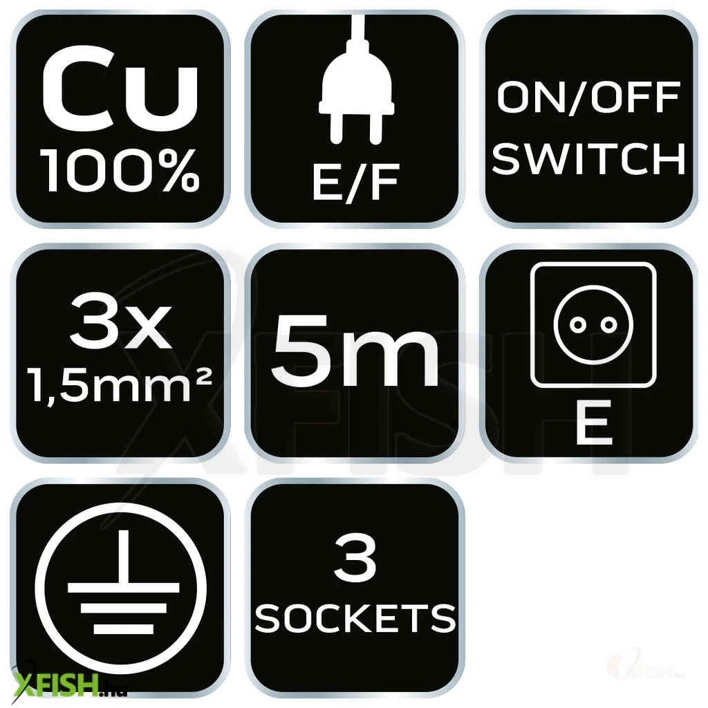 Neotools hálózati elosztó, kapcsolós, 3 aljzat, 5m/ 3x1,5mm2 kábel, fehér