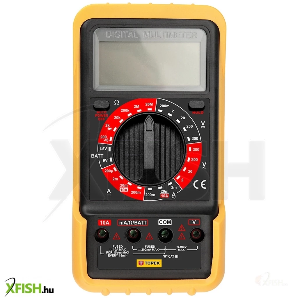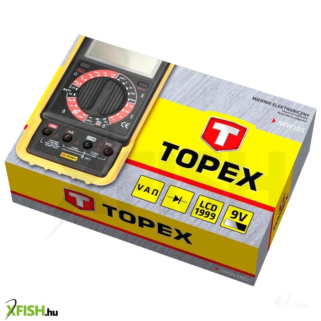 MULTIMÉTER, digitális, 94W105, TOPEX - a digitális berendezések legfontosabb paramétereinek méréséhez nélkülözhetetlen műszer. 6 funkcióval rendelkezik - váltóáram és egyenáram feszültségmérés, váltóáramerőség-mérés, elektromos ellenállásmérés, továbbá diódamérés és rendelkezik „HOLD" funkcióval is. Ez utóbbi funkció lehetővé teszi a mérési eredmény mentését/tárolását. A mérőműszer könnyen kezelhető, és a nagyméretű LCD-kijelzőn jól olvashatók a mérési eredmények.