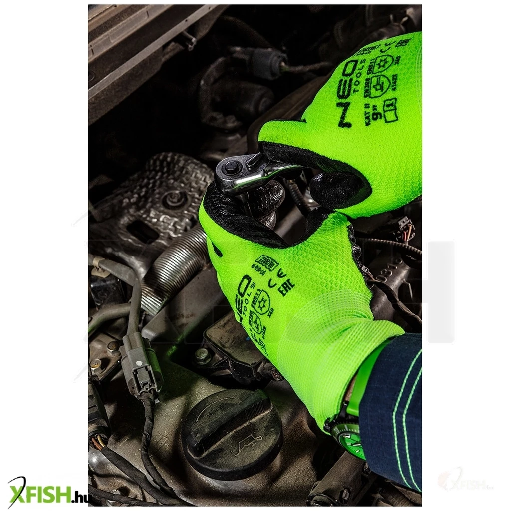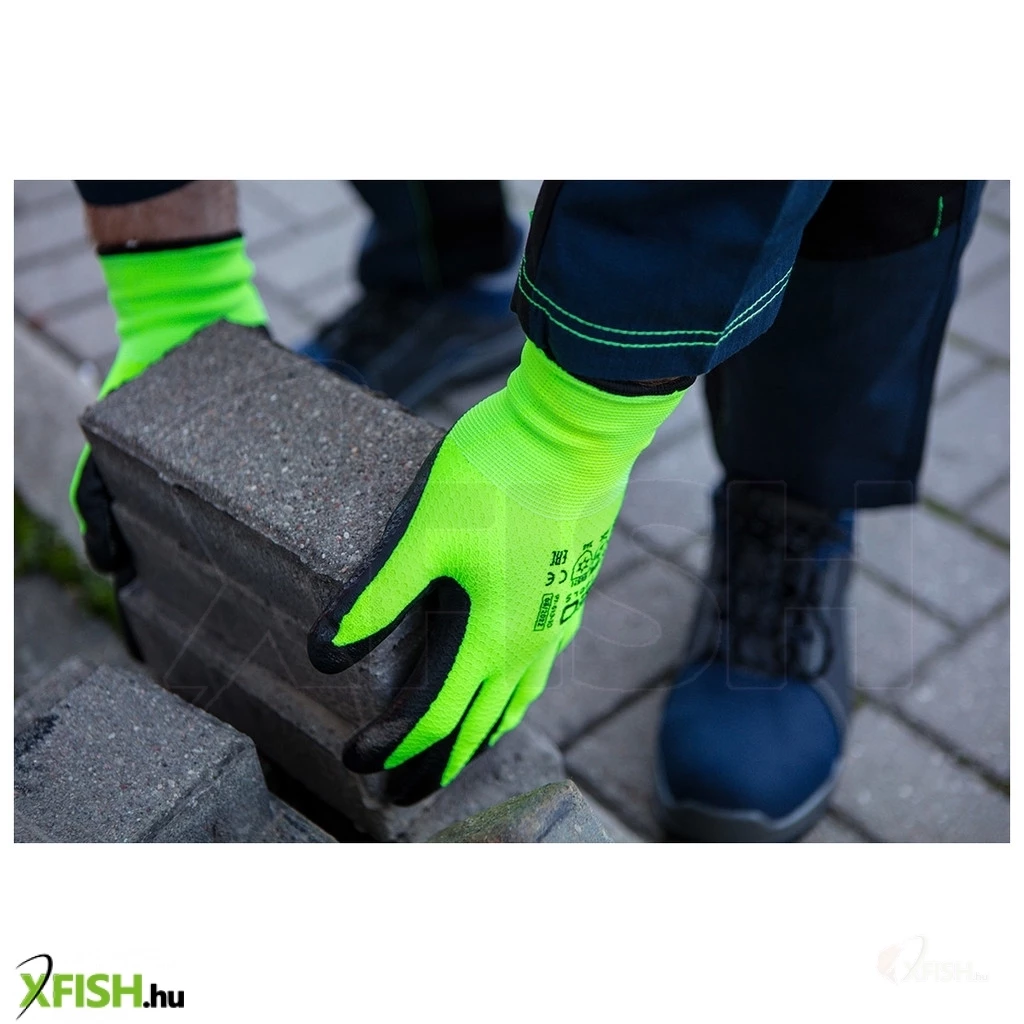 A kesztyű latex bevonata fokozza a tapadást, így biztosítva a stabil fogást még nedves vagy olajos környezetben is. Ez különösen hasznos lehet építőipari vagy logisztikai feladatok esetében, ahol a kezek biztonsága és a megfelelő tapadás elengedhetetlen a balesetek megelőzésére. Az EN 388 szabványnak megfelelő 4142x mechanikai ellenállási szint mutatja, hogy a kesztyű kiemelkedő védelmet nyújt a kopás, vágás, szakadás és szúrás ellen, így garantálva hosszú élettartamot és megbízható védelmet.