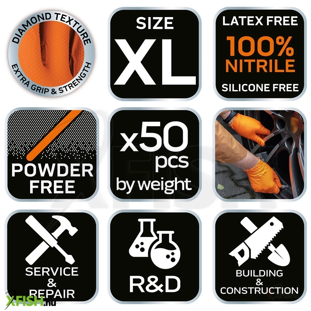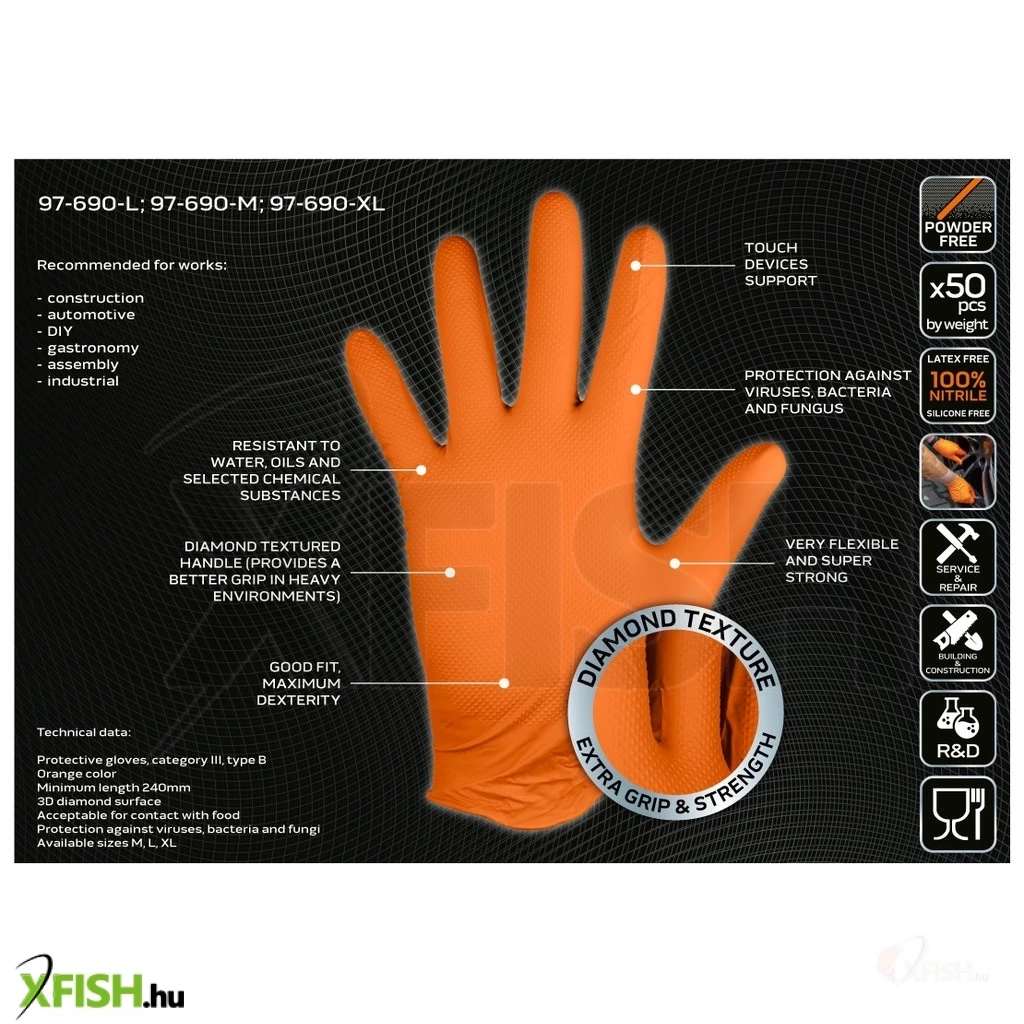 A narancssárga szín nemcsak esztétikus, de praktikus is, hiszen jól láthatóvá teszi a kesztyűt, így könnyen észrevehető a vízparton vagy a szerelékek között. A kesztyű XL mérete biztosítja, hogy a nagyobb kezű felhasználók is kényelmesen dolgozhassanak benne. A dobozban található 50 darabos kiszerelés garantálja, hogy mindig legyen tartalékban elég kesztyű, így nem kell aggódnia az idő előtti elfogyás miatt.