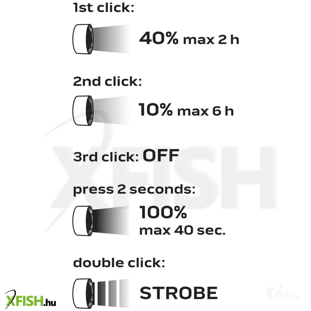 - Világítási funkciók: 100% (max. 40 mp), 40%, 10%, stroboszkóp
