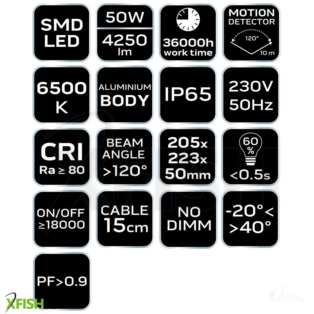 A mozgásérzékelő egy beépített búra alatt található, és síkban, valamint függőlegesen is állítható, így a fény pontosan ott világít, ahol szükség van rá. A készülék érzékelési szöge 120 fok, hatósugara pedig legfeljebb 10 méter, ami kiemelkedő rugalmasságot biztosít a használat során. A reflektor SMD LED-del van felszerelve, amely kiváló fényerőt biztosít 4000 lumen teljesítménnyel.