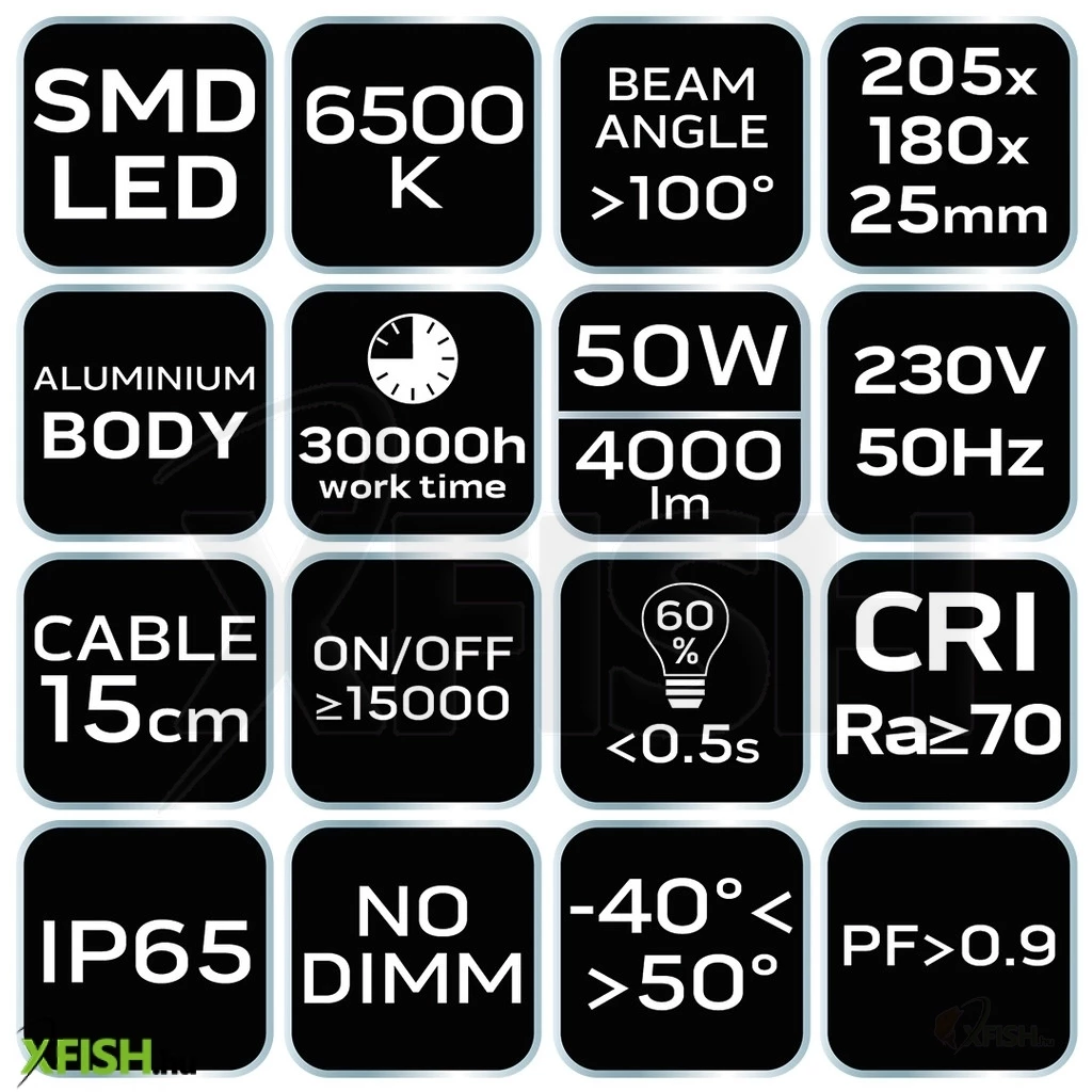 A reflektor számos előnye közé tartozik, hogy 50 W teljesítményű, a 4000 lumen fényáram pedig biztosítja a szükséges világosságot. A 6500 Kelvin színhőmérséklet biztosítja a természetes megvilágítást, és a <0,5 másodperces felmelegedési idő pedig az azonnali világítást. Az alumínium és üveg anyag használatának köszönhetően a szerkezet könnyű és ellenálló. A reflektor élettartama eléri a 30 000 órát, és 15 000 ki-/bekapcsolási ciklusra tervezték, így hosszú távon számíthat a megbízhatóságára.
