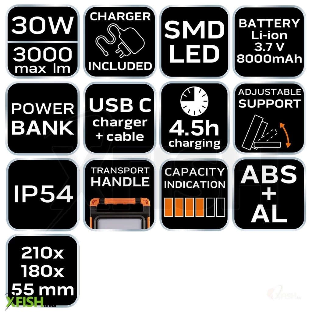 A termék további paraméterei: teljesítménye 30 W, méretei pedig 210 x 180 x 55 mm. Ideális választás azok számára, akik kompakt, de erőteljes világítási megoldást keresnek, akár horgászathoz, építési vagy karbantartási munkákhoz.